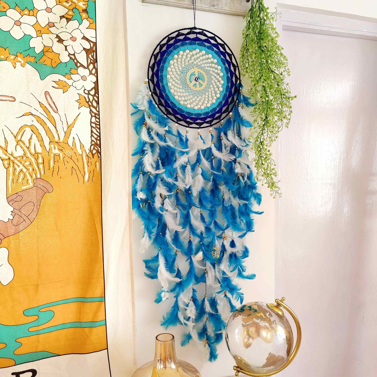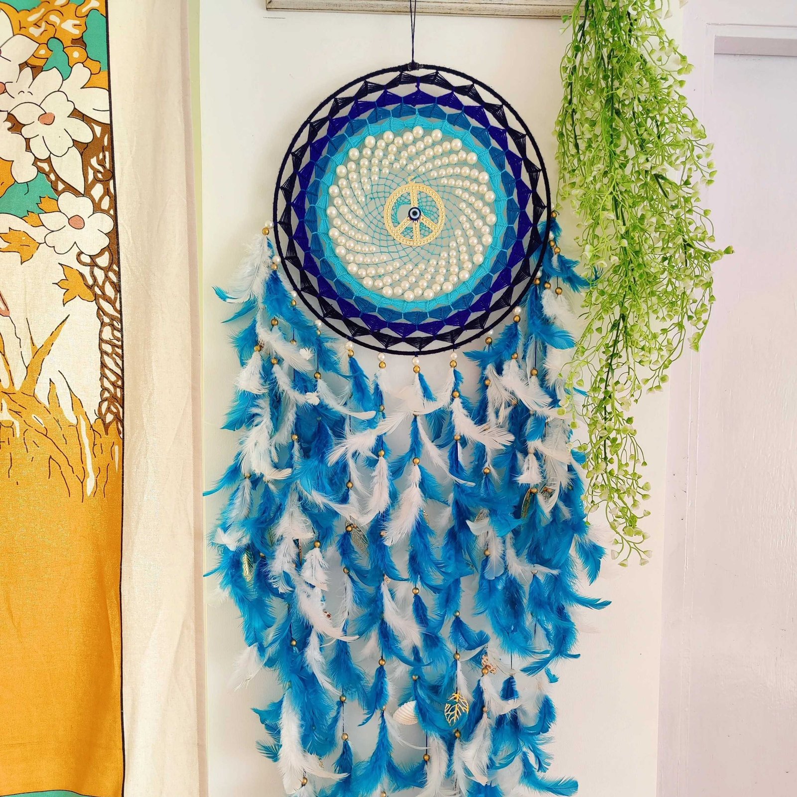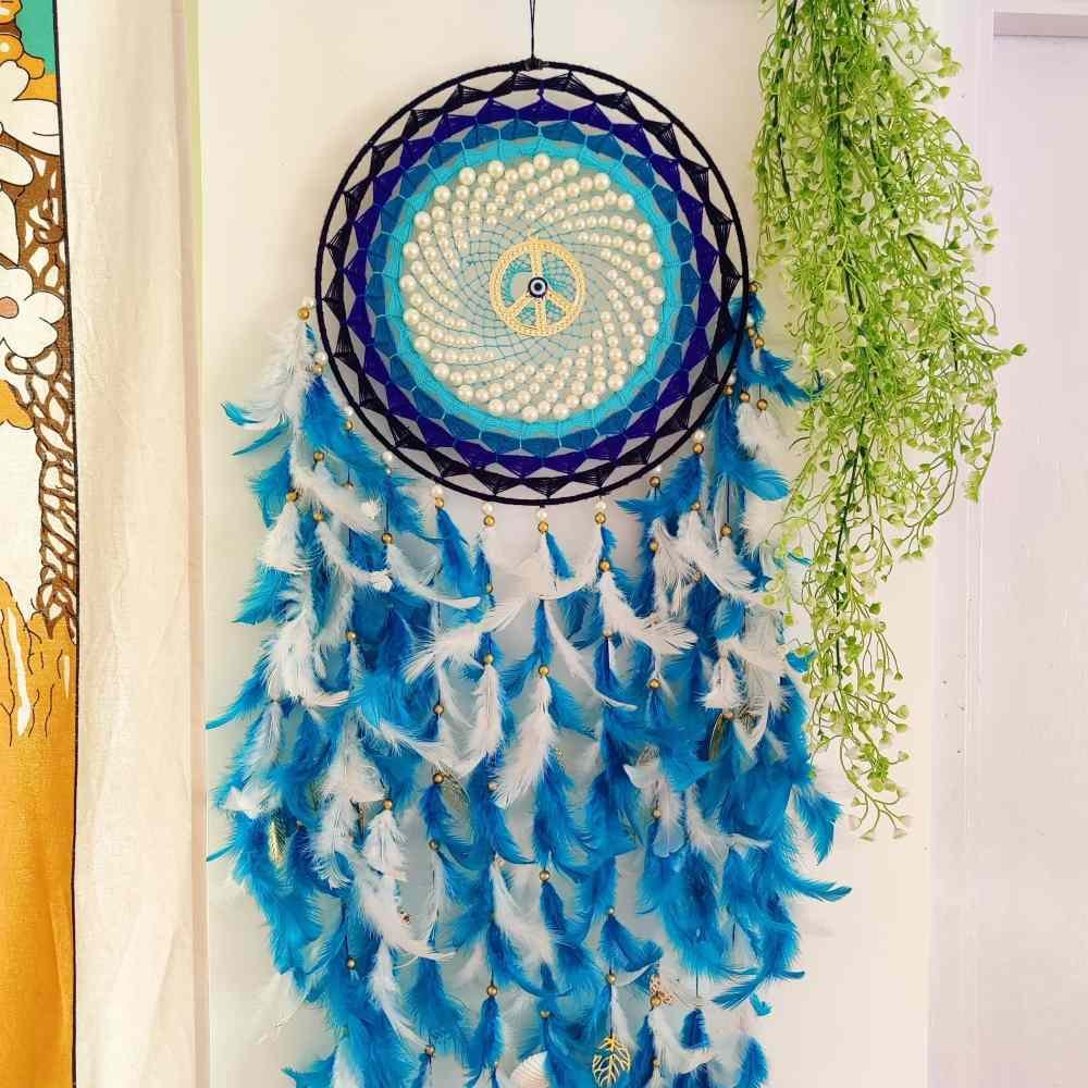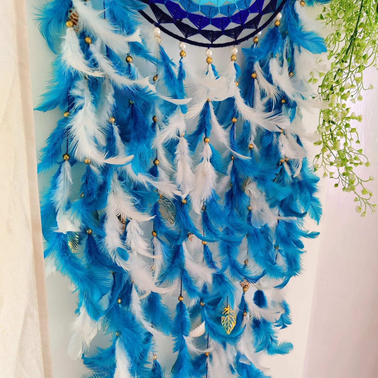 Boho Bohemian Flair — Handcrafted with thoughtful detail, this dreamcatcher blends soft blue and white tones with textural depth, creating a visual that’s both soothing and artisan-inspired.