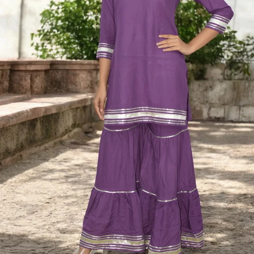 Set includes a kurta/top, flared sharara bottoms and a printed cotton dupatta for a complete ethnic look.