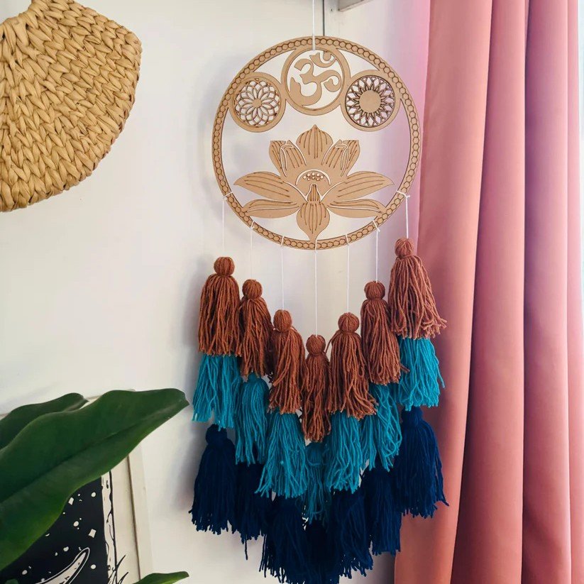 Elevate your space with the soothing elegance of the Lotus Charm Tassel Dreamcatcher. Crafted with wooden rings and threads in beautiful shades of brown and blue, this 10-inch diameter, 30-inch height décor piece brings a pop of color and charm to any room. Its boho-inspired design makes it perfect as a self-gift or a thoughtful present for friends and family on birthdays or special occasions.