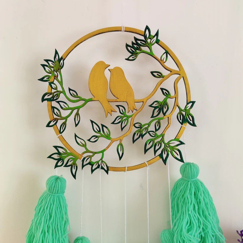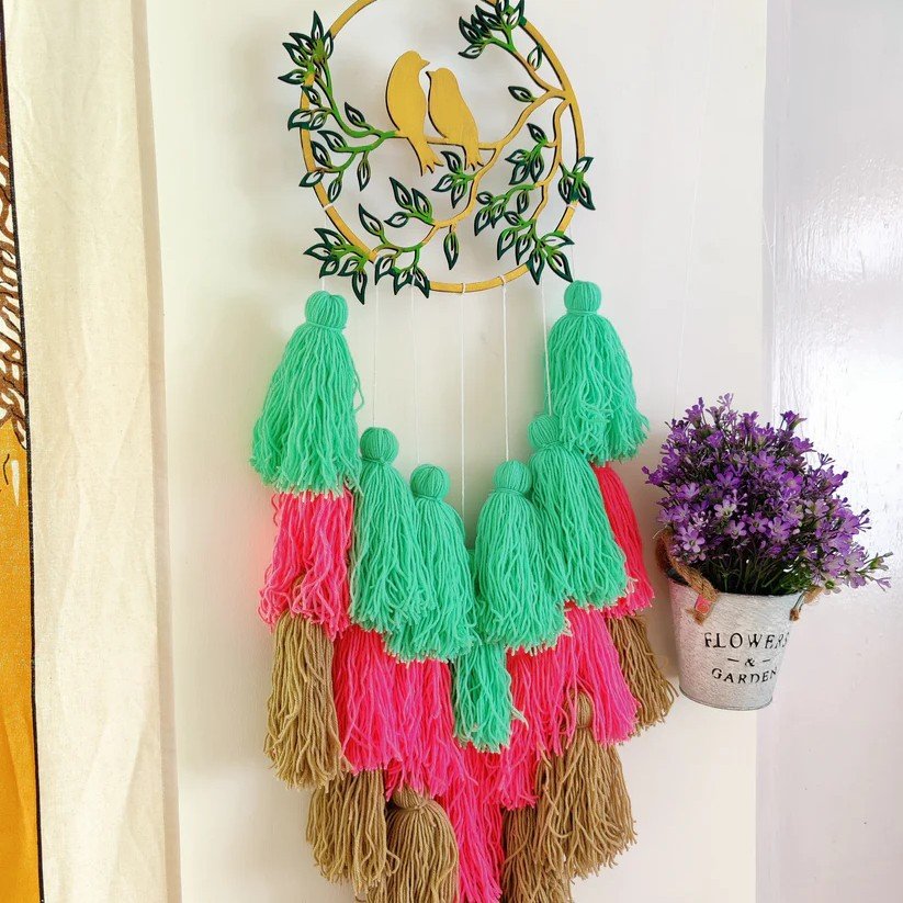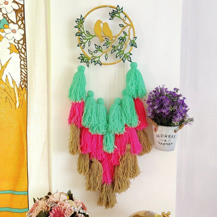 Add a cheerful splash of color to your space with the Love Birds Tassel Dreamcatcher. Made with wool and MDF, this handcrafted dreamcatcher features vibrant hues that brighten up any room while enhancing a boho-chic vibe. Perfect for gifting or as a charming addition to your home decor.
