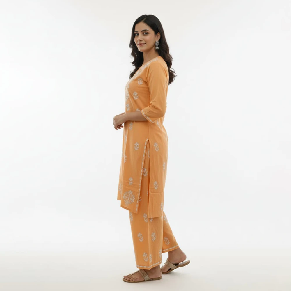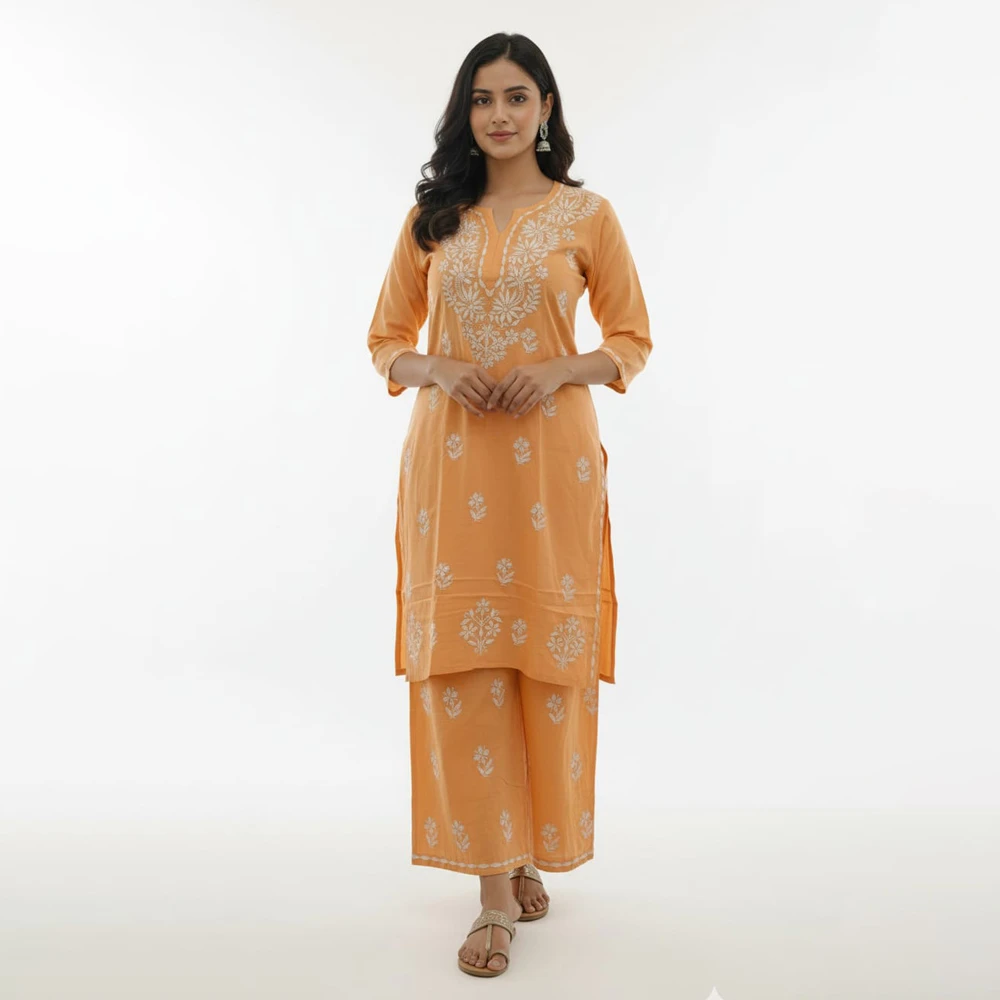 Crafted from premium-quality cotton, the kurta set ensures breathability and comfort throughout the day. The soft peach hue paired with white thread embroidery gives the outfit a fresh, graceful, and uplifting look. The matching palazzo adds ease of movement and completes the ethnic charm, making it suitable for festivals, office hours, family gatherings, or daily outings.
