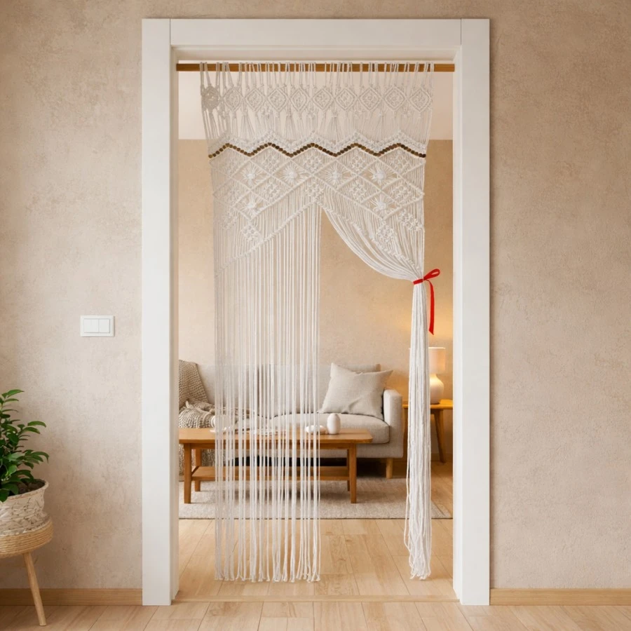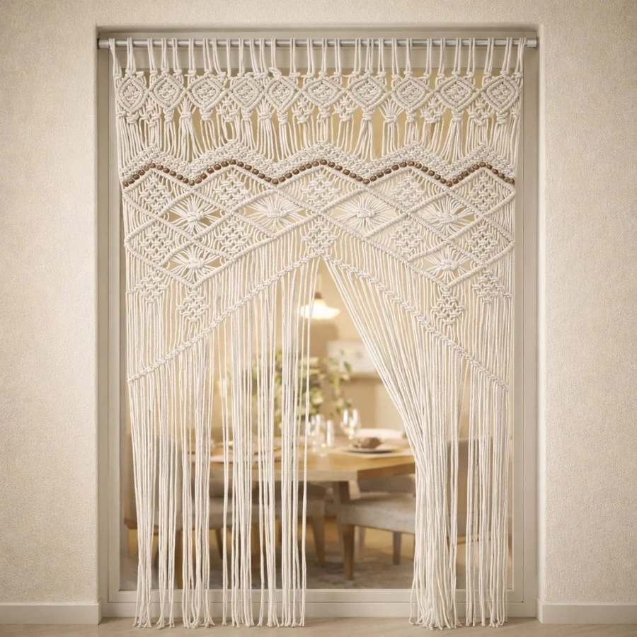 Enhance your home with this beautifully Handcrafted Macrame Door Curtain, designed to bring an elegant boho-chic touch to your interiors. Made from premium quality 100% cotton cord, this macrame partition curtain features intricate knotting patterns, long flowing tassels, and a sophisticated design that instantly elevates any doorway, window, or wall space.