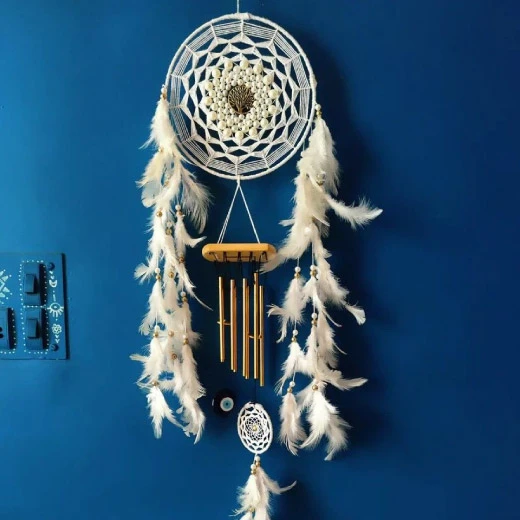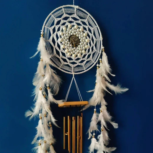 Beautifully crafted with a woven Tree of Life design, this dreamcatcher includes a secondary inner hoop and elegant wind chimes—bringing soft visuals and gentle melodies into any space.