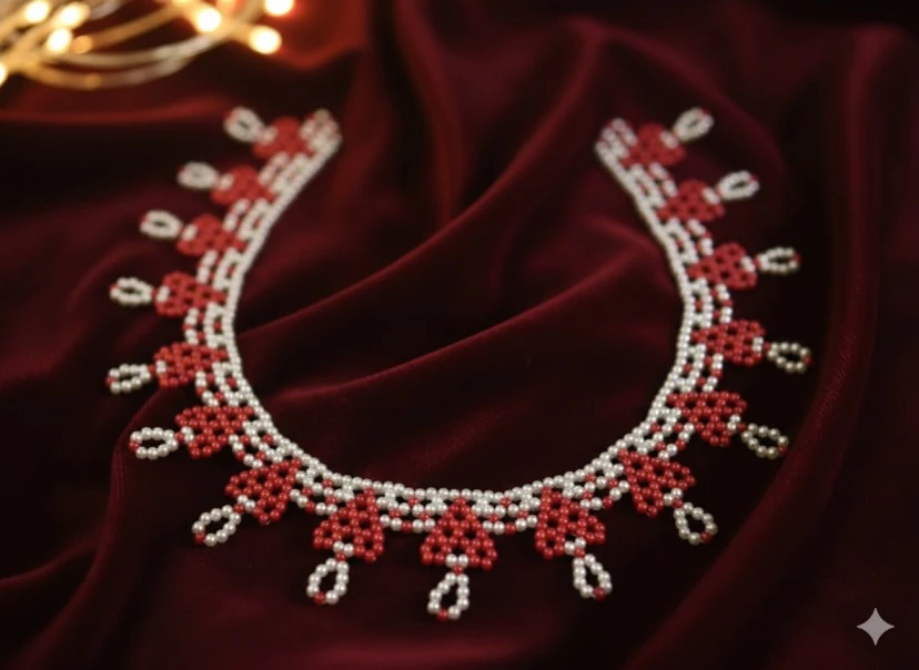 A Moti Mahirap (also known as a Pearl Beaded Rangoli or Taat Rangoli) is a handcrafted decorative item made from shiny plastic pearl beads (moti) arranged into intricate patterns. "Mahirap" is a traditional term for a decorative, often floral or geometric design, and "moti" refers to the beads used.
