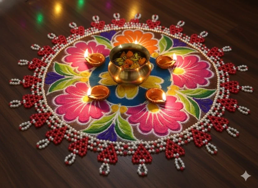 Rangoli: Used as a substitute for traditional powder rangoli, often placed on tables or floors, particularly for the Chaitrangan or Rukhwat (wedding decoration).
