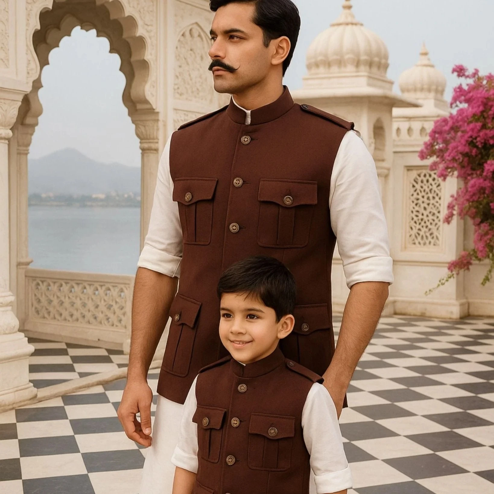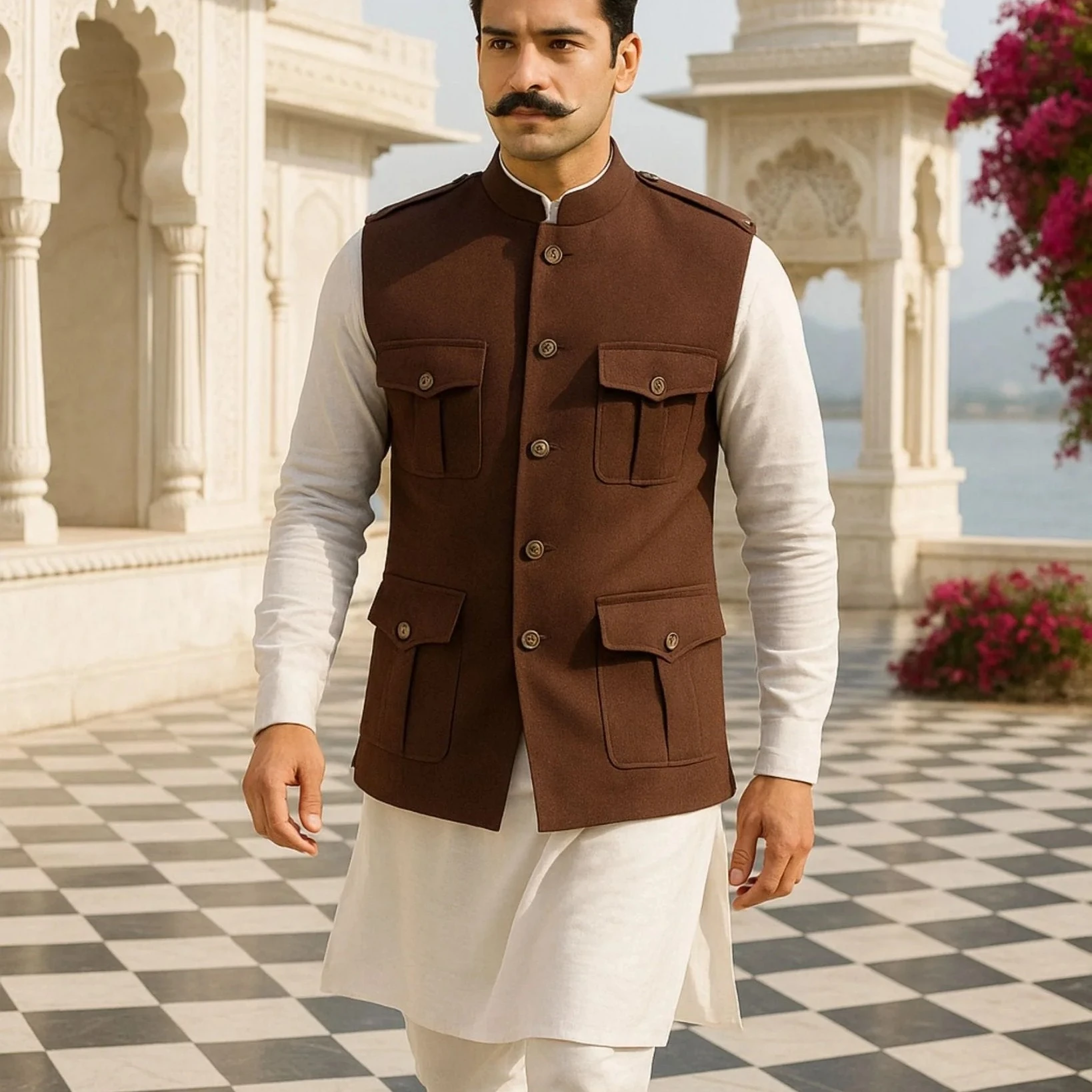 Crafted for comfort and style, it allows you to layer effortlessly over a kurta-pyjama, churidar or even a dress shirt and trousers — perfect for both traditional and modern ensembles. The plain-button design keeps it refined and adaptable, while the tailored shape gives a polished finish suitable for special occasions.
