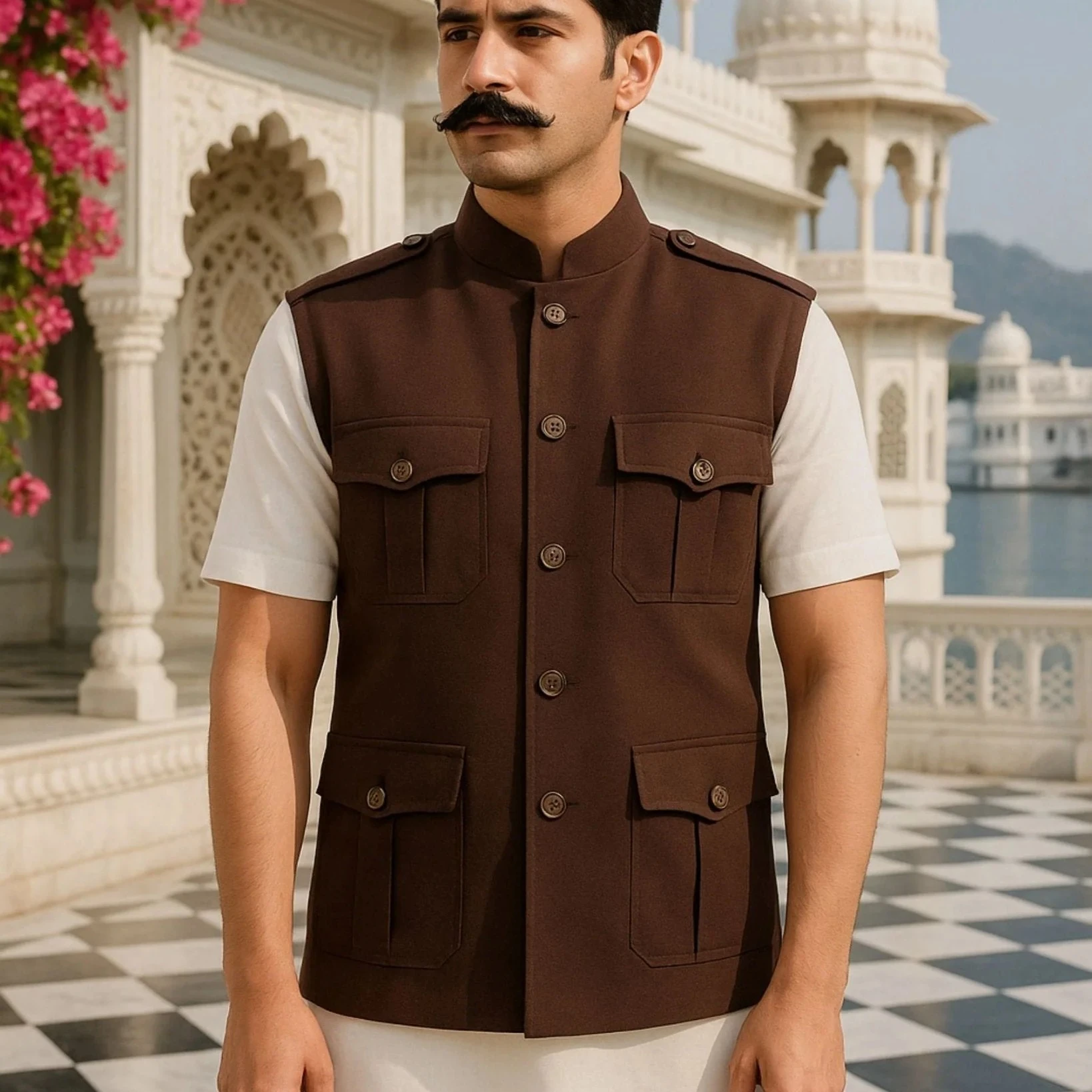 Upgrade your festive-wear lineup with this versatile Men’s Coffee Plain-Button Hunting Jacket, designed to merge effortless style with smart ethnic layering. Featuring a rich coffee-tone finish, this jacket offers a sleek sleeveless silhouette with a clean front-button closure that elevates any outfit for weddings, receptions or cultural events.