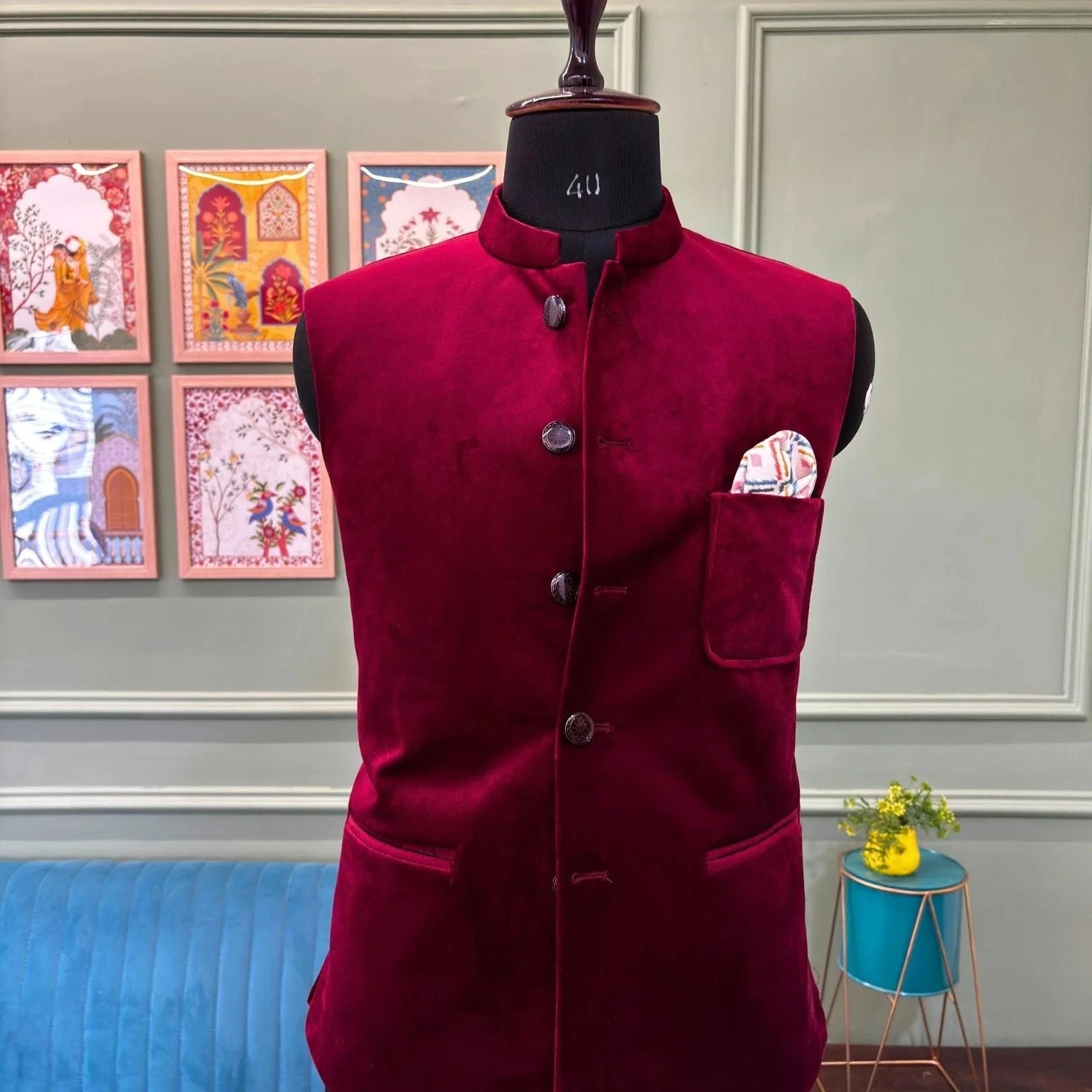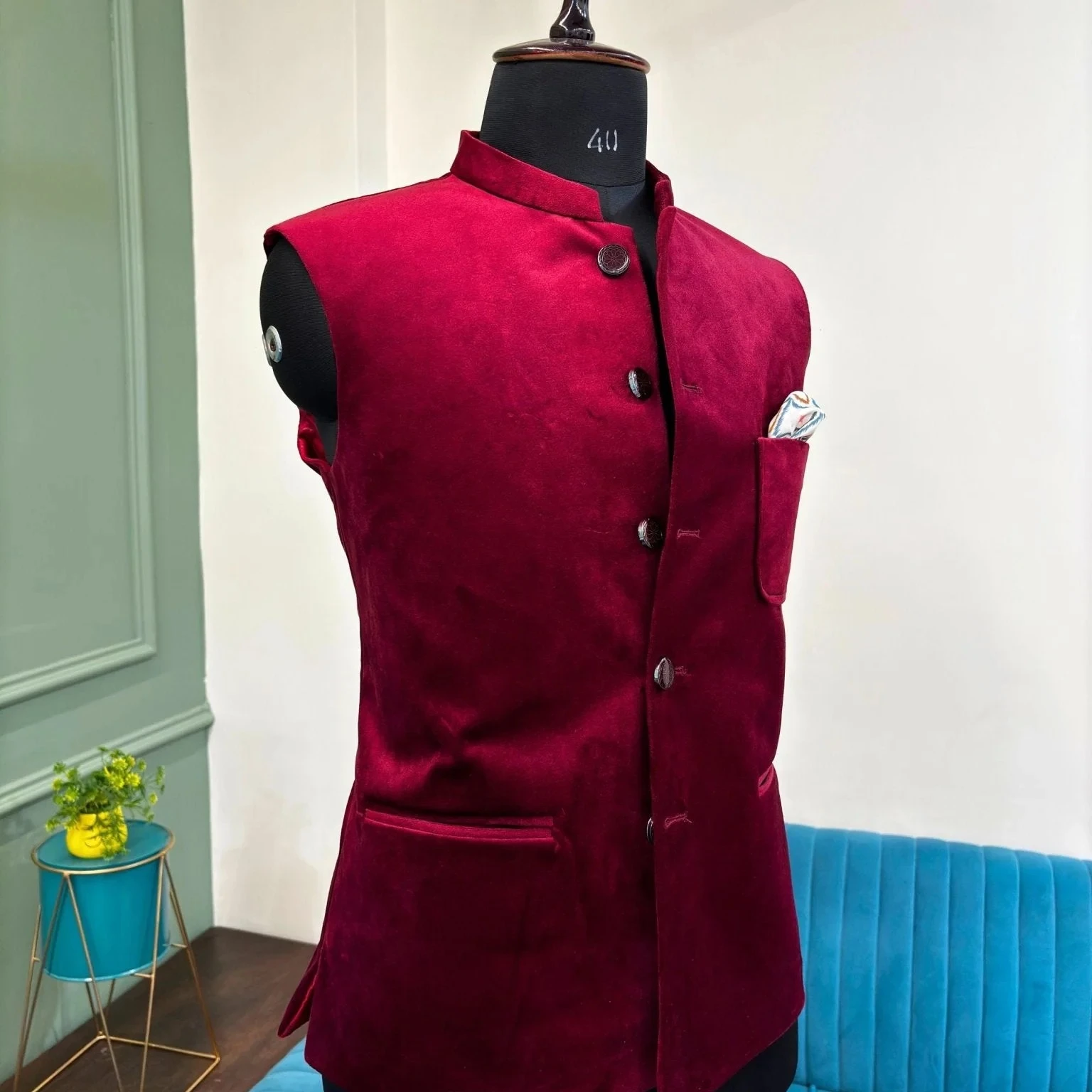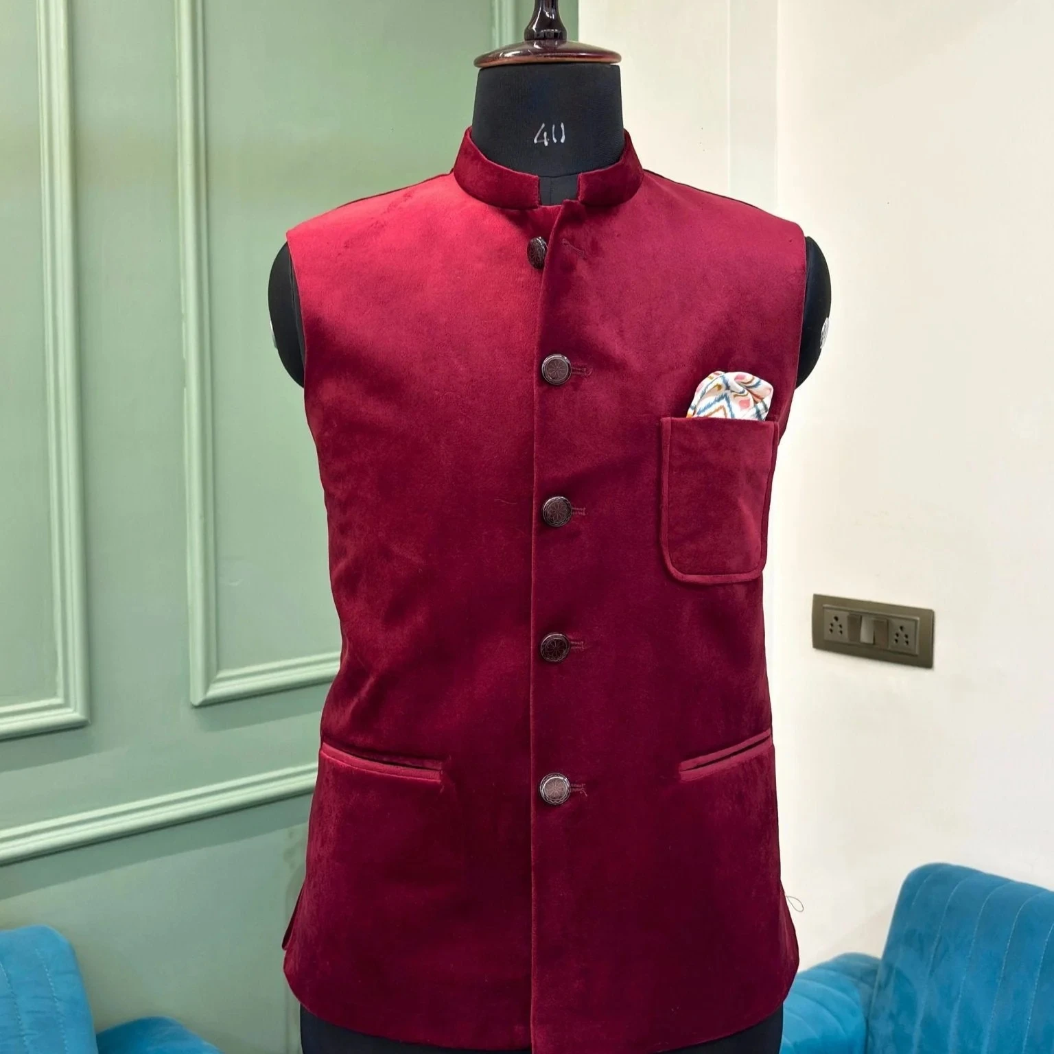 Elevate your ethnic wardrobe with this rich Maroon Velvet Nehru/Modi Koti Jacket. Tailored in premium velvet fabric, it features a mandarin (stand) collar, button-front closure, and a hip-length jacket cut ideal for layering. The deep maroon shade adds sumptuous appeal for weddings, festive events or standout ethnic evenings—while still pairing seamlessly with both traditional and modern looks.