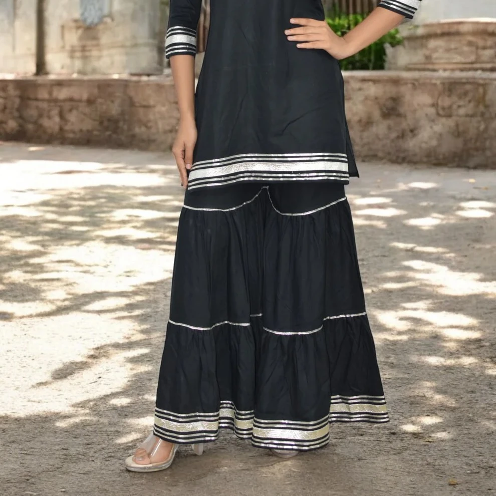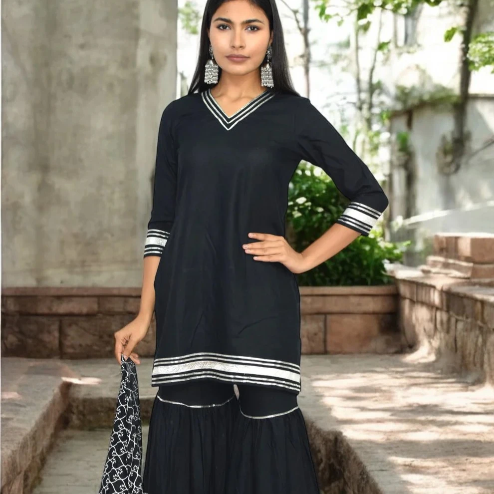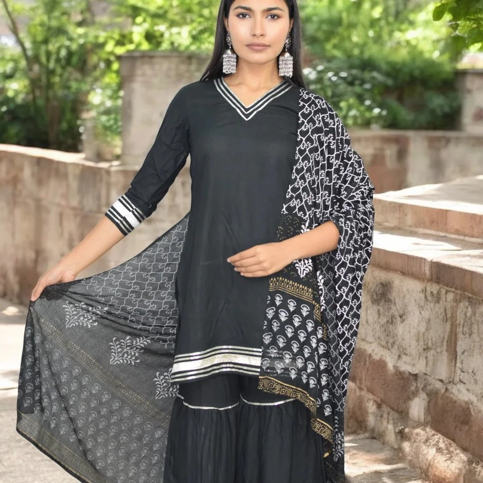 Complete set includes a kurta/top, flared sharara bottoms and a coordinating dupatta for a full ethnic look.