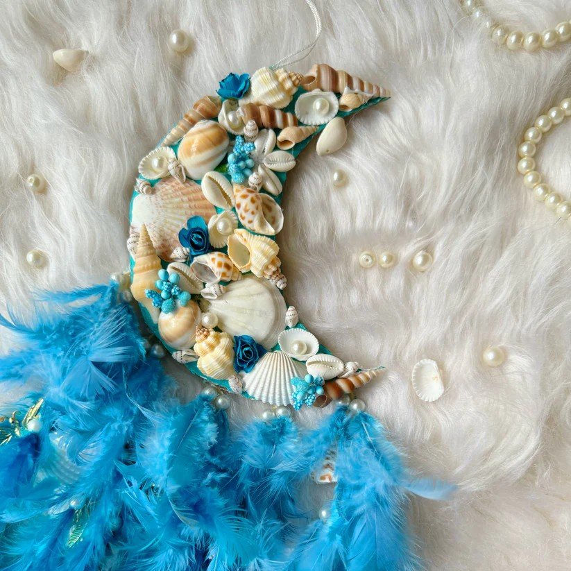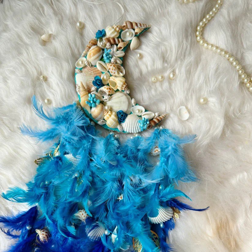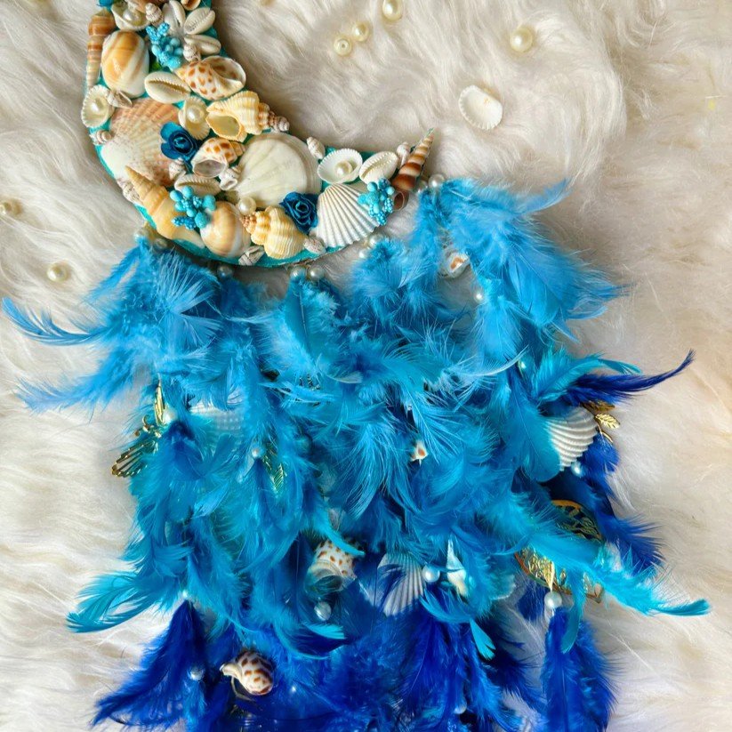 Bring a splash of bohemian charm to any space with our Mini Blue Moon Flora Dreamcatcher. Designed to captivate and inspire, this handcrafted crescent moon decor blends natural seashells and vibrant blue feathers to create an elegant centerpiece.