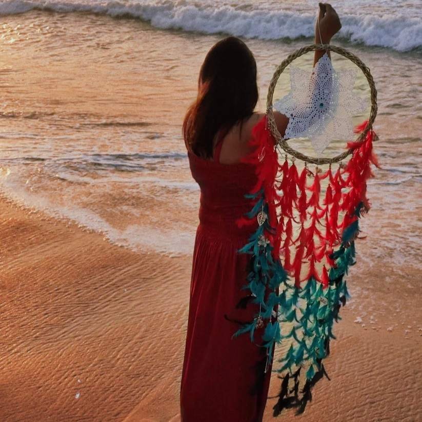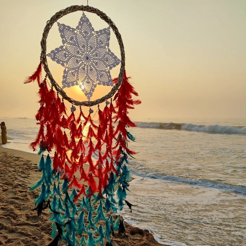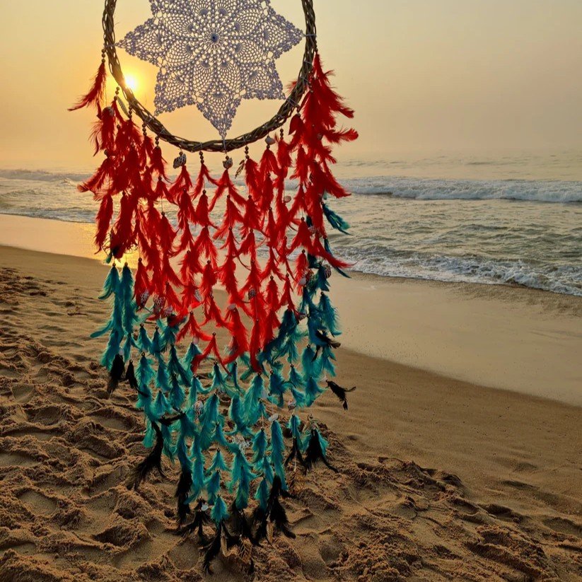 Bring a wave of color and elegance into your home with the Moana Giant Crochet Dreamcatcher. Designed with a large 17-inch diameter and cascading 5-foot length, this stunning decor piece features multicolour ribbons, soft feathers, and a handcrafted wooden ring. Its vibrant tones and boho flair make it an ideal centerpiece for bedrooms, living spaces, or cozy corners.