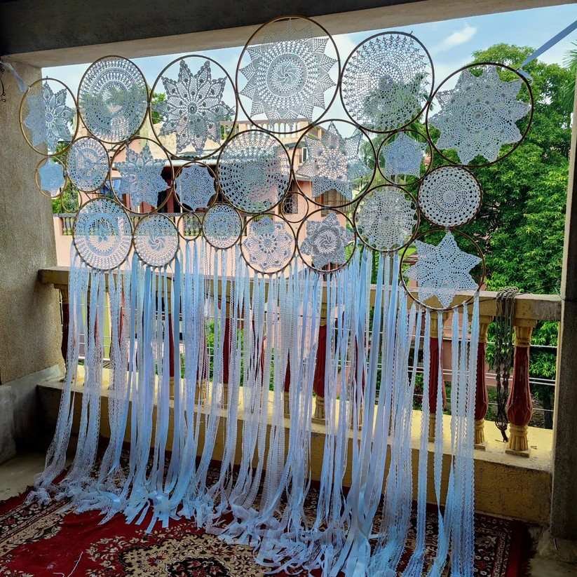 With its grand size of 8ft × 8ft, this dreamcatcher makes a striking wall décor, curtain, or backdrop for haldi ceremonies, weddings, birthdays, and home styling. A thoughtful gift or a soulful addition to your own space, it creates an aura of charm, lightness, and bohemian elegance.