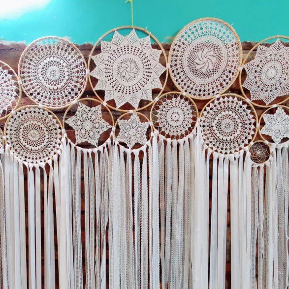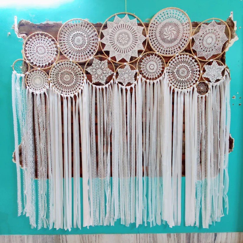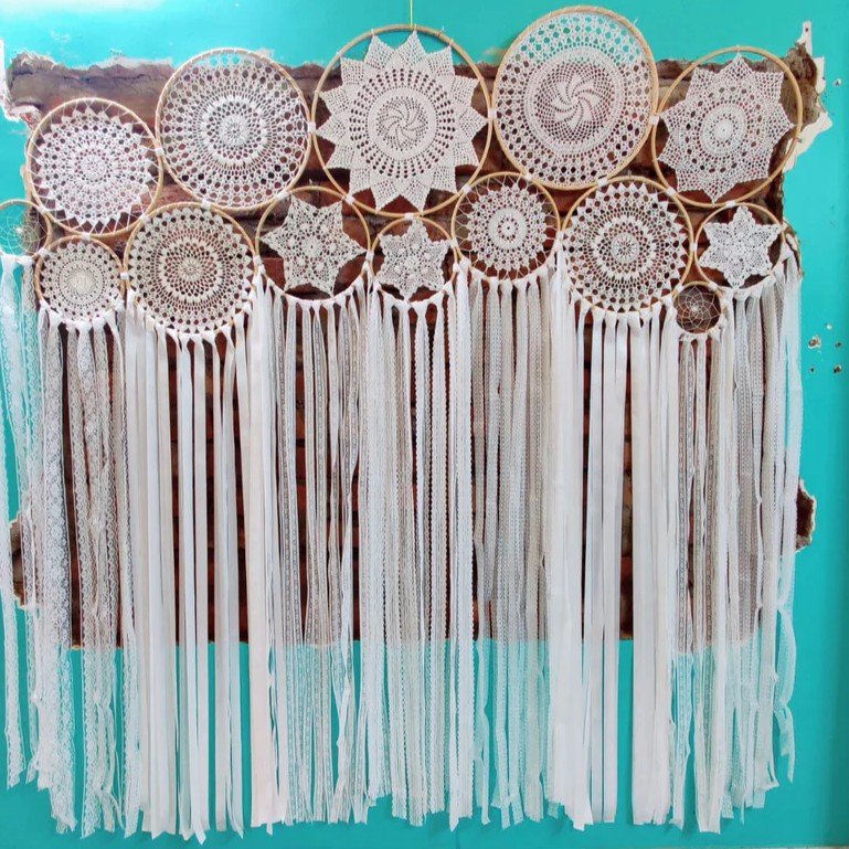 Add a touch of elegance and subtle charm to any space with the Moondust Small Cluster Dreamcatcher. Made from wooden rings, crochet, threads, lace, and ribbon, this handcrafted piece radiates soft, bohemian beauty. Its all-white design complements any décor style, making it perfect for bedrooms, living rooms, or event backdrops.