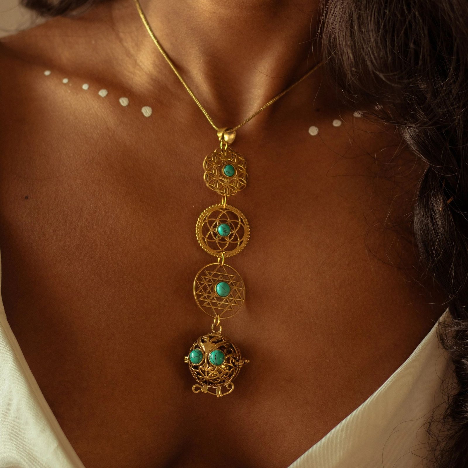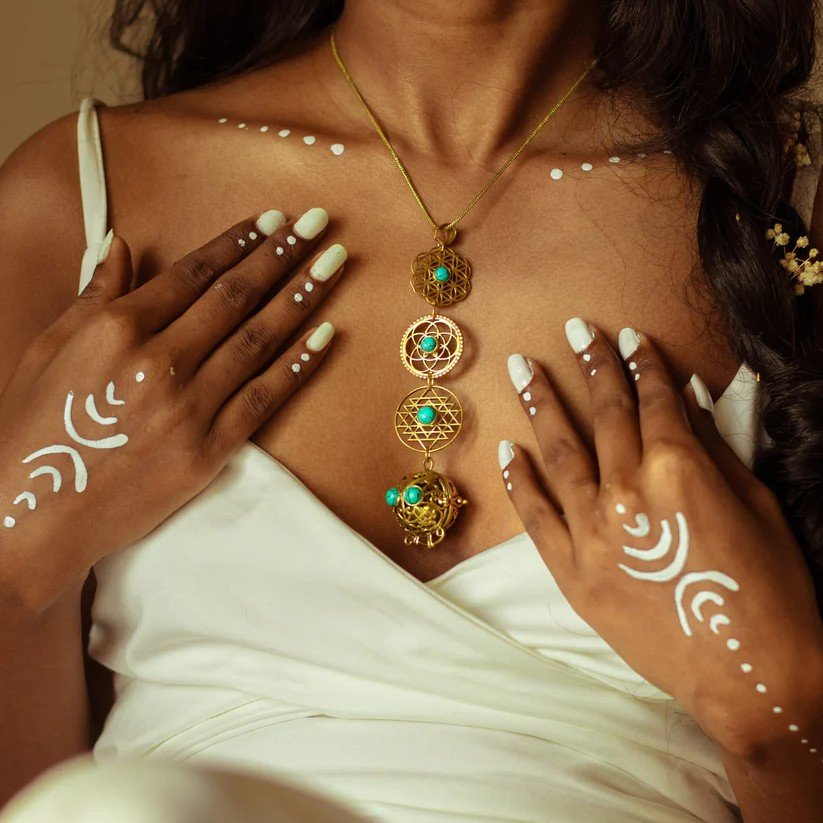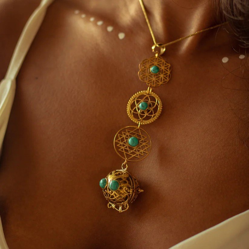 Featuring a beautifully crafted music ball and intricate mandala symbols, this pendant invites you to embrace your inner goddess and express your spiritual self with grace and elegance.