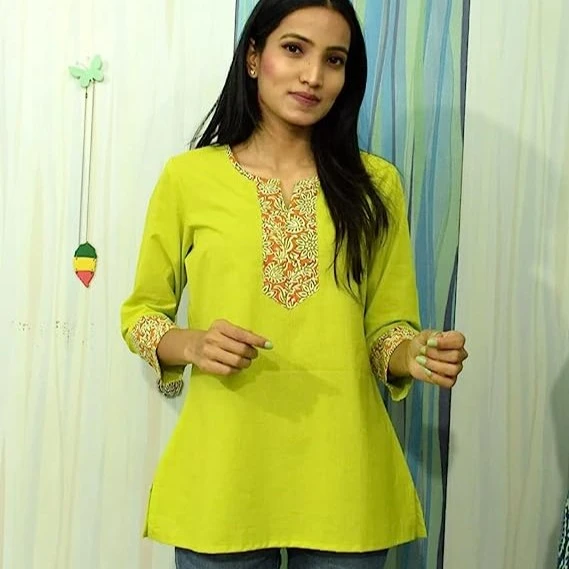 Add a pop of color to your wardrobe with the Neon Green Short Kurti Top. Crafted from 100% pure cotton, this kurti features a unique neck design and vibrant neon green hue. The hand block printing techniques of Sanganeri and Bagru add traditional charm to the modern silhouette.