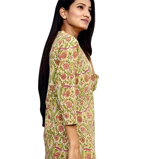 Embrace the elegance of traditional craftsmanship with this Off White Short Women Hand Print Kurti. Crafted from 100% pure cotton, this kurti offers breathable comfort, making it suitable for all seasons. The off-white base, combined with intricate hand block prints, adds a touch of artisanal charm to a modern silhouette. Designed with three-fourth sleeves and a relaxed fit, it ensures ease of movement and a flattering look.