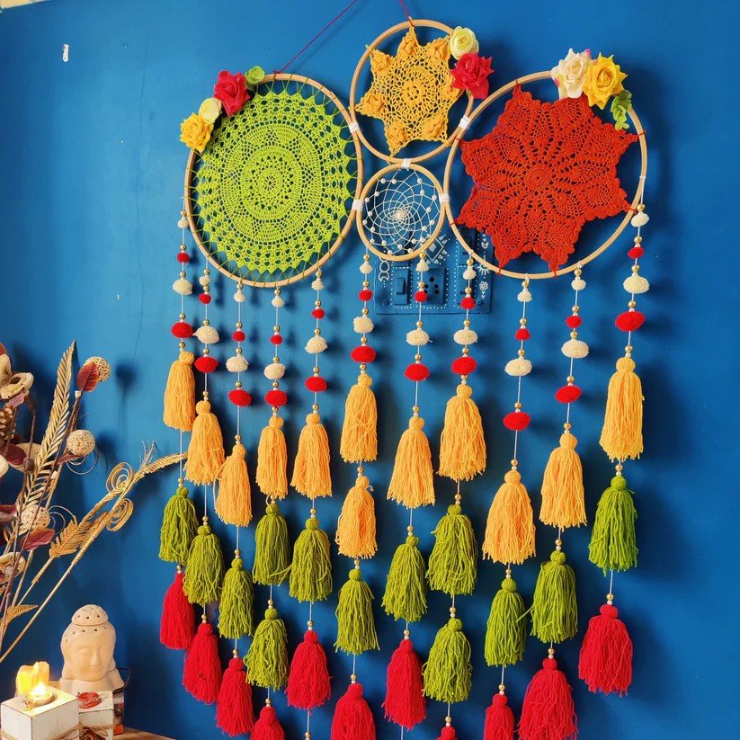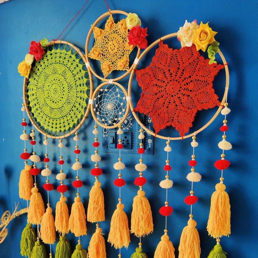 Materials Used: Wooden rings, crochet patterns, threads, artificial flowers, and a cane ring for a textured, handcrafted look