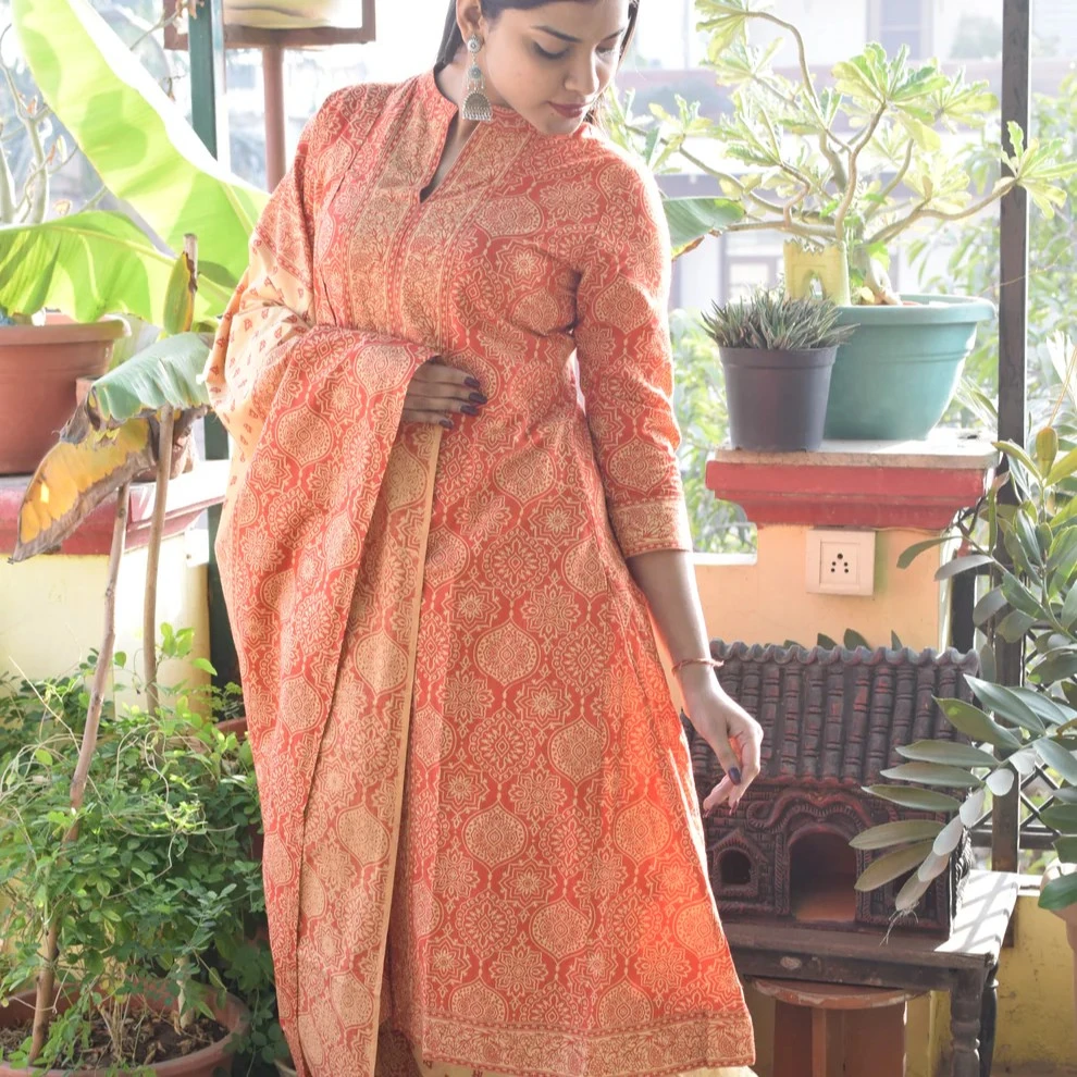Styled in a cheerful orange colour with traditional Sanganeri block‑print motifs—an artisanal touch rooted in heritage.