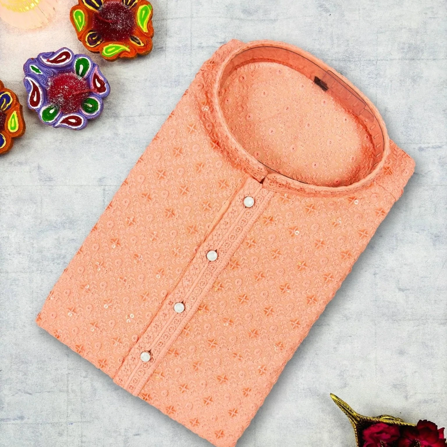 Refresh your ethnic wardrobe with the Peach Square Lucknowi Kurta. Crafted from 100% premium cotton, this kurta features a soft peach-colored base adorned with subtle square-motif detailing inspired by traditional Lucknowi craft. The straight-cut silhouette with full sleeves and mandarin collar offers both comfort and sophistication—perfect for festive gatherings, cultural events or elevated everyday wear.