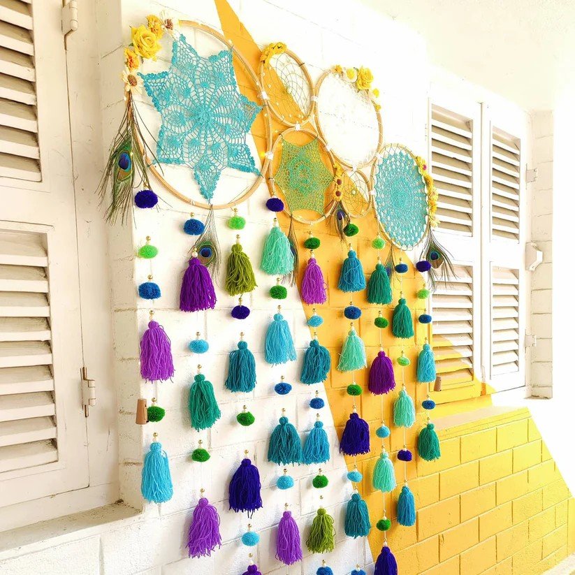 Bring home the charm of nature with the Peacock Themed Cluster Dreamcatcher, handcrafted with wooden rings, crochet, threads, and artificial flowers. Inspired by the vibrant hues of a peacock, this multi-color boho dreamcatcher adds a burst of elegance and positivity to any room.