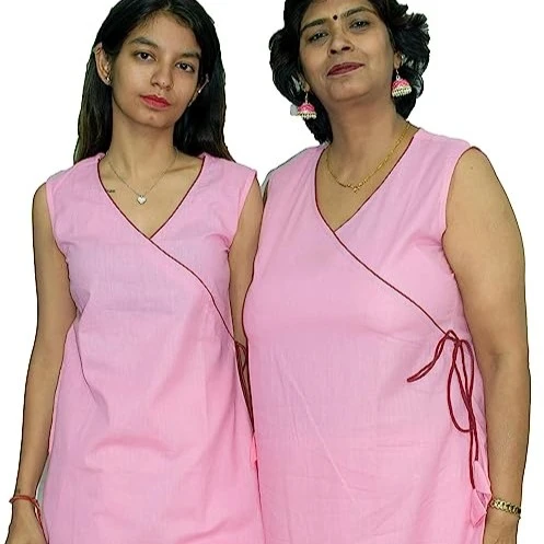 Colour & Design: Elegant pink hue with an angrakha-style top featuring wrap cross-over front and matching bottom for a coordinated look.