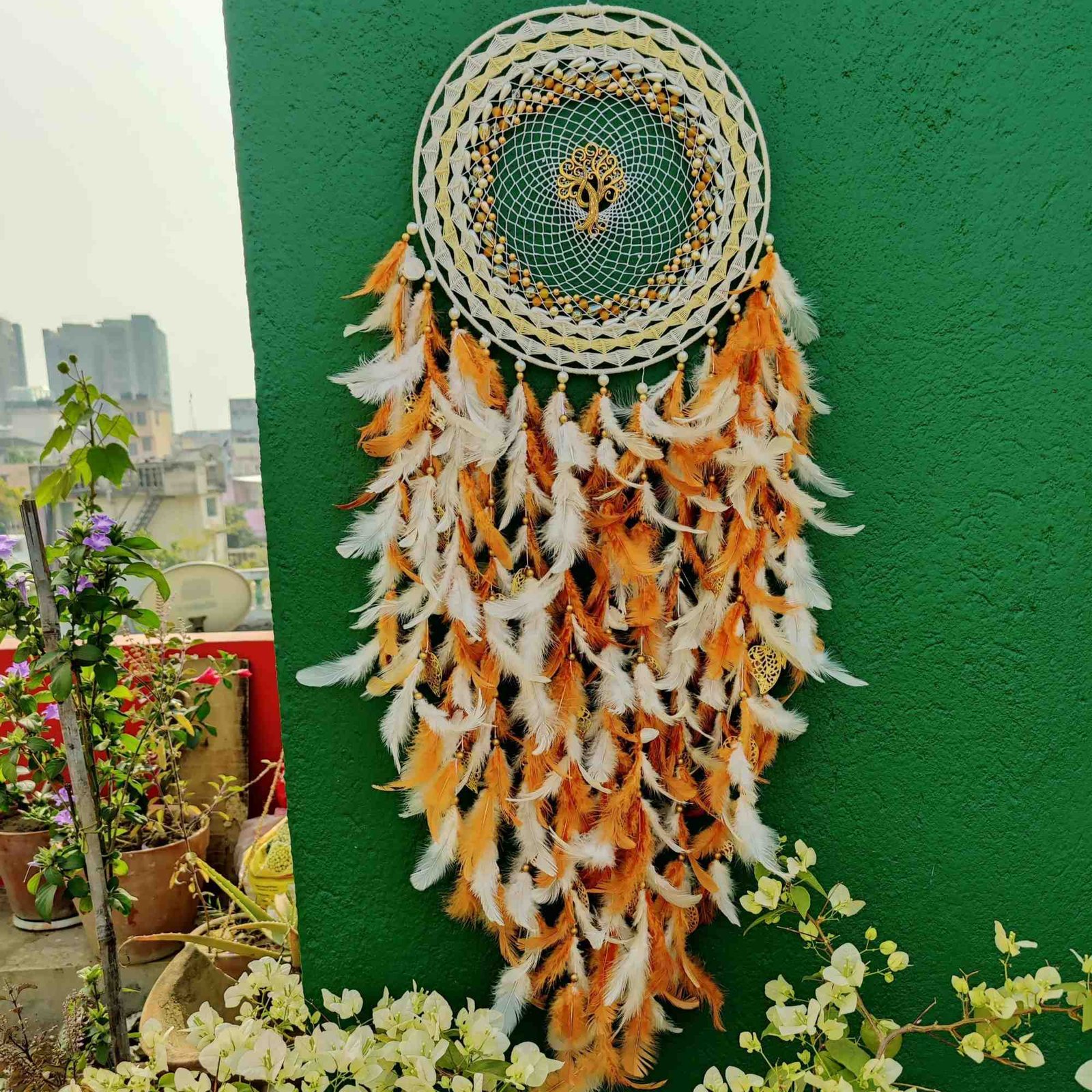 Elevate your home décor with the Pure Spirit Dreamcatcher, a harmonious blend of elegance and bohemian charm. Crafted with a steel ring wrapped in soft wool, intricate cobweb weaving, high-quality feathers, and metal charms, this dreamcatcher creates a striking centerpiece in any room. Its warm tones of white, brown, and orange bring vibrancy while maintaining a soothing and natural aesthetic.
