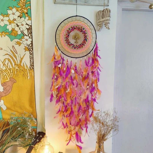 Materials: Steel ring wrapped with cozy wool, featuring intricate cobweb crochet, paired with high-quality feathers and metal charms for rich decorative texture