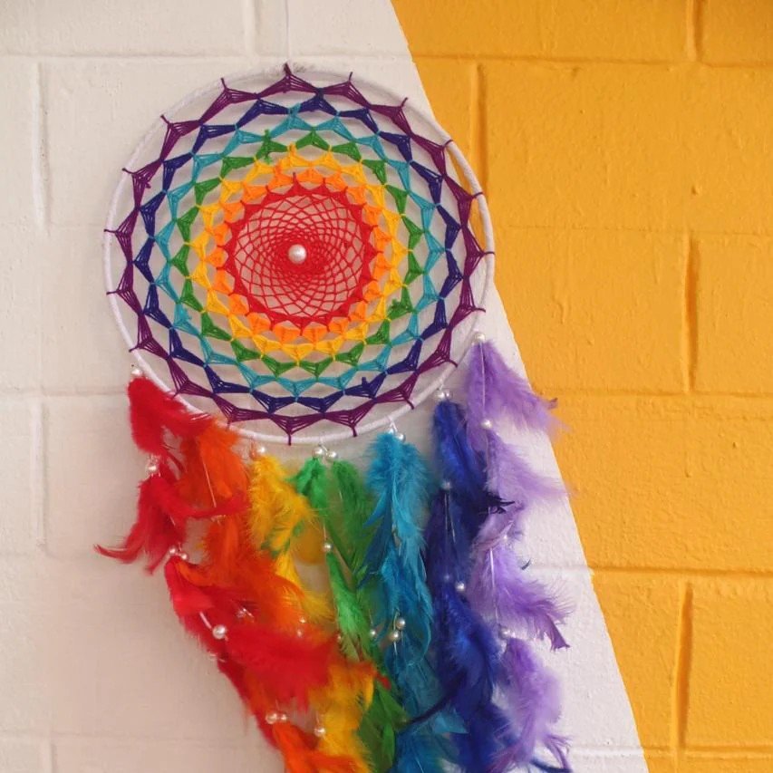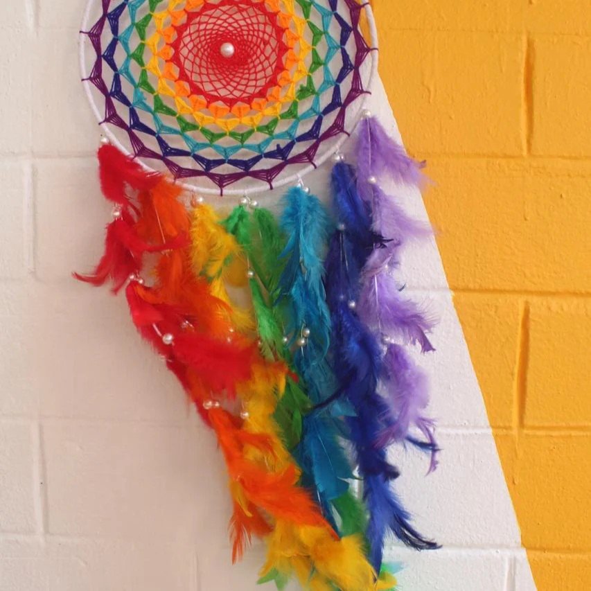 Bring vibrant color and boho charm to your space with the Rainbow Big Dreamcatcher. Crafted with wool, feathers, and threads, this handcrafted piece is designed to brighten any room while adding a touch of artistic elegance. Its multi-color design makes it a perfect centerpiece for bedrooms, living rooms, or even as a thoughtful gift.