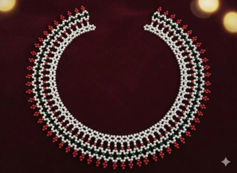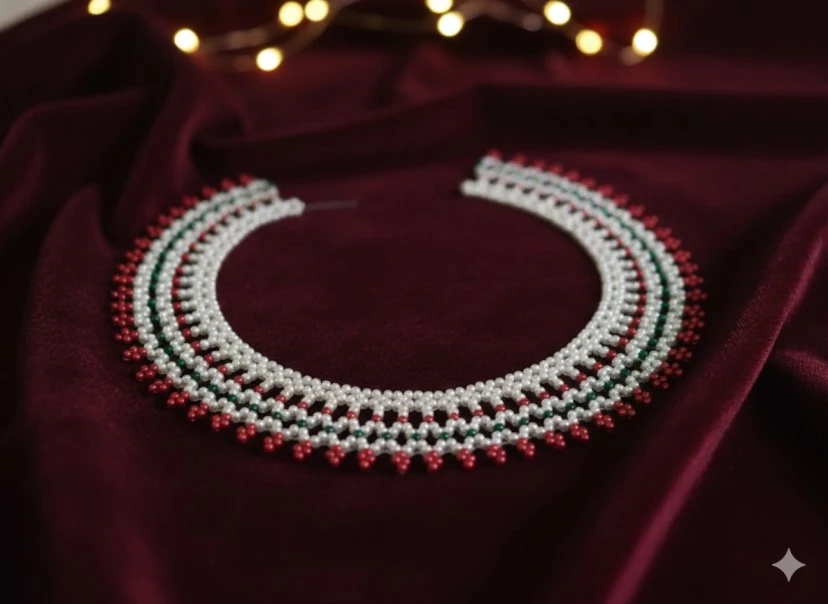 A Moti Mahirap (also known as a Pearl Beaded Rangoli or Taat Rangoli) is a handcrafted decorative item made from shiny plastic pearl beads (moti) arranged into intricate patterns. "Mahirap" is a traditional term for a decorative, often floral or geometric design, and "moti" refers to the beads used.