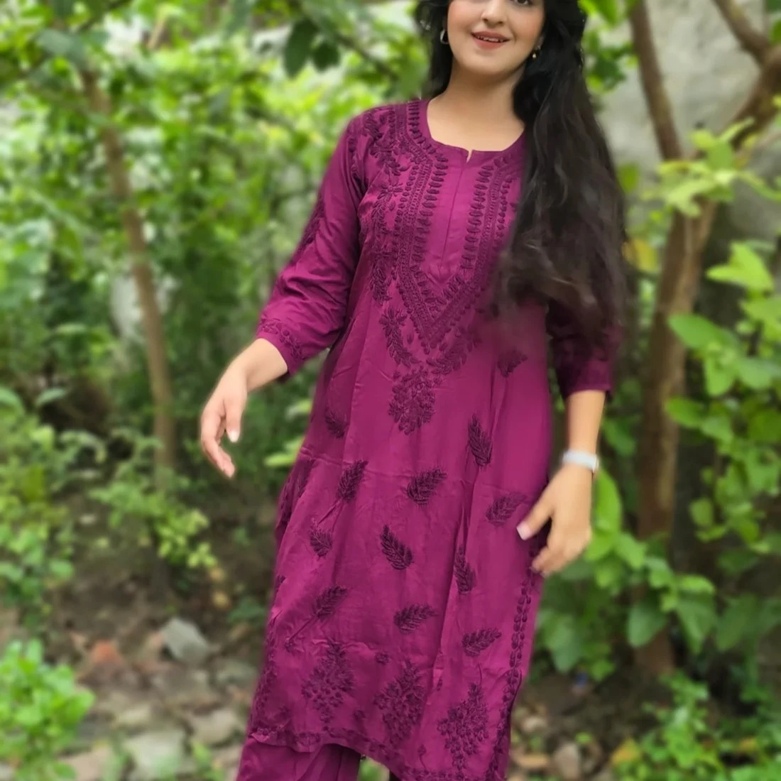 The kurta is designed with a round neckline and 3/4 sleeves, giving it a classic look thatβs both modest and stylish. Paired with flowing palazzo pants made from the same soft rayon, the set ensures freedom of movement and all-day comfort. This coordinated two-piece is perfect for professional settings, ethnic outings, or casual celebrations.