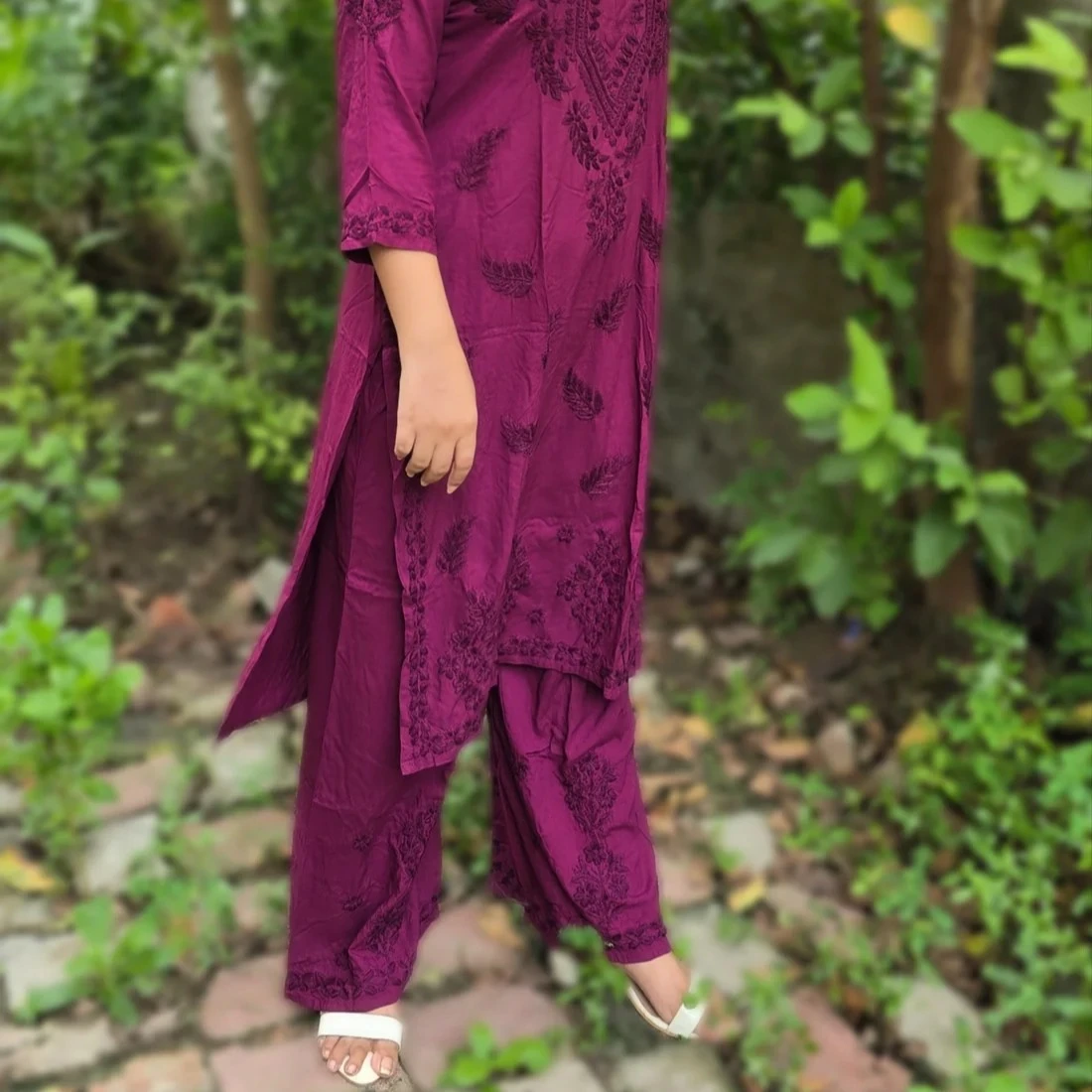 Showcasing delicate craftsmanship and timeless design, this Rayon Chikankari Kurta & Palazzo Set (Set 1) features a straight-cut kurta made from breathable, fluid rayon that drapes beautifully. The chikankari embroidery adds a refined traditional touch that elevates the outfitβs elegance.