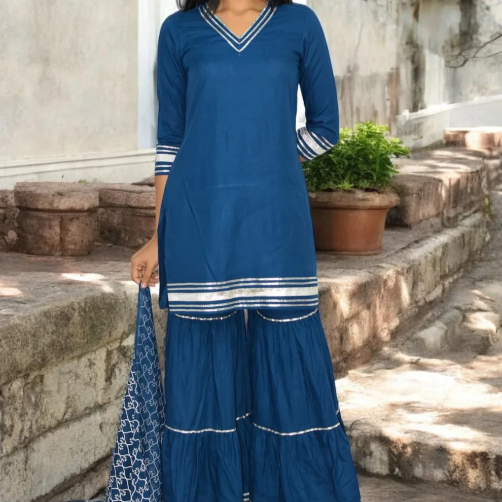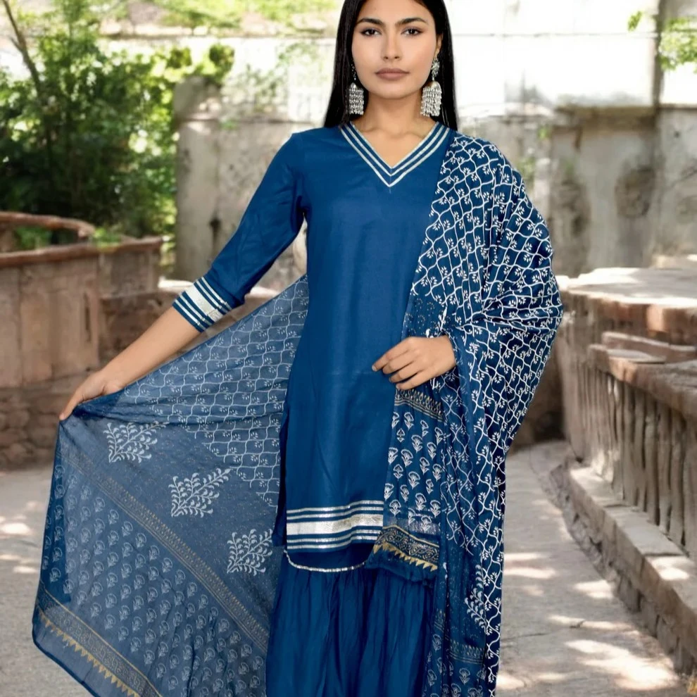 Complete set includes a matching kurta/top, flared sharara bottoms and coordinating dupatta (if applicable) for a polished ethnic outfit.