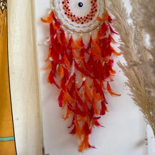 Layered, Textural Artistry – Constructed with a sturdy steel ring wrapped in intricate threadwork, accented by feathers, beads, and shells for rich detail and movement.