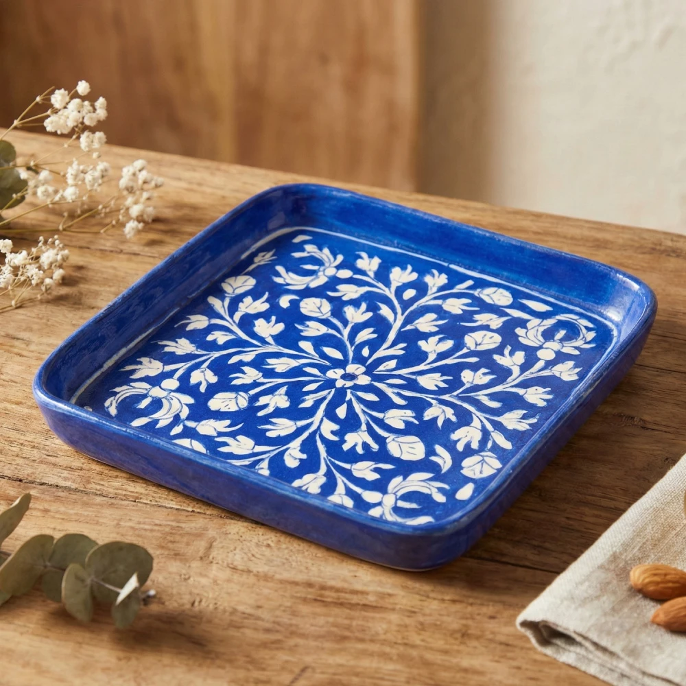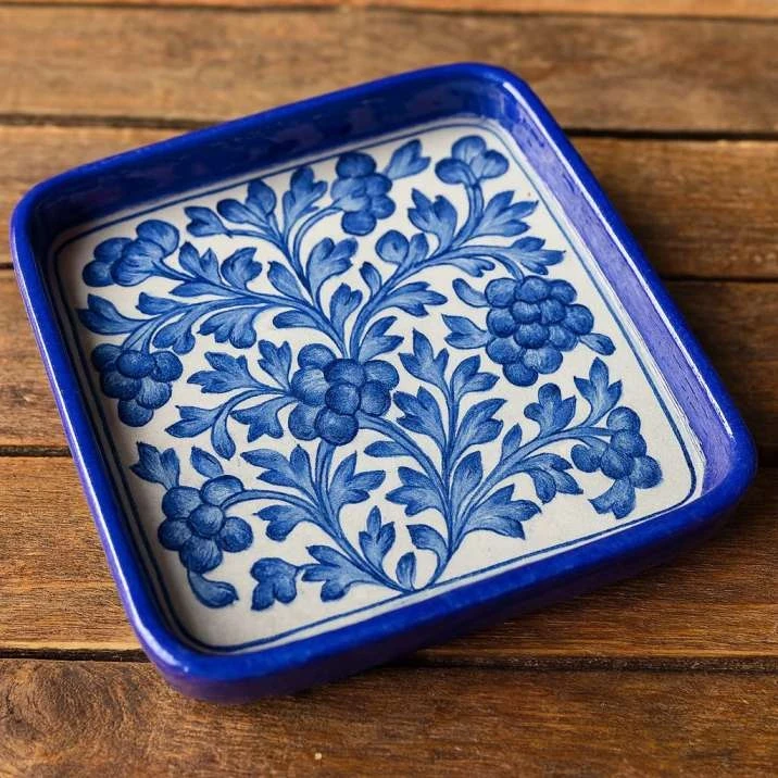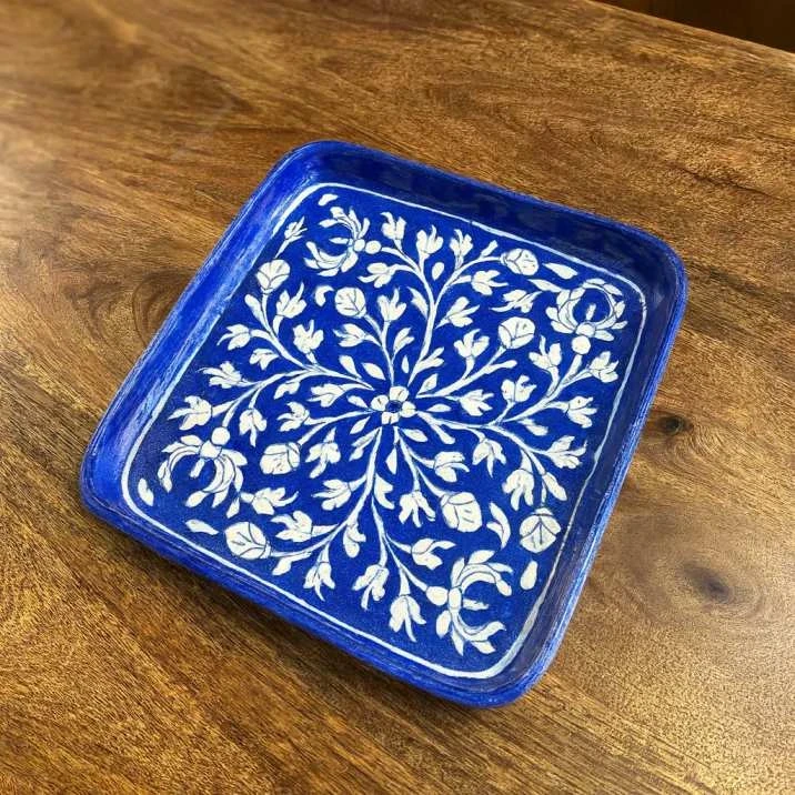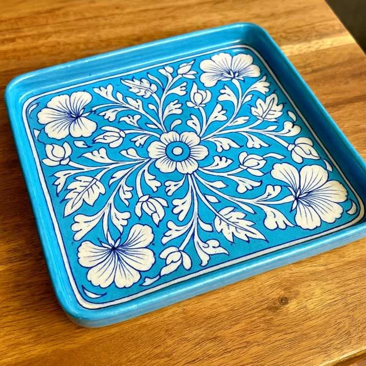 Elevate your entertaining with this exquisite hand-painted blue pottery serving tray, a true masterpiece of traditional Rajasthani craftsmanship. Each tray is meticulously handcrafted by skilled artisans in Jaipur, renowned for their vibrant blue pottery.