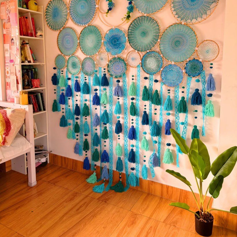 Composed of multiple wooden hoops interwoven with crochet and threadwork, accented by artificial florals—this oversized design brings layered texture and dynamic movement to any wall.
