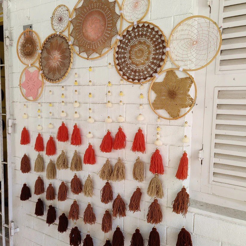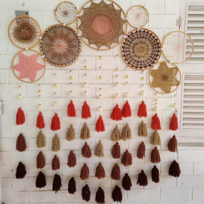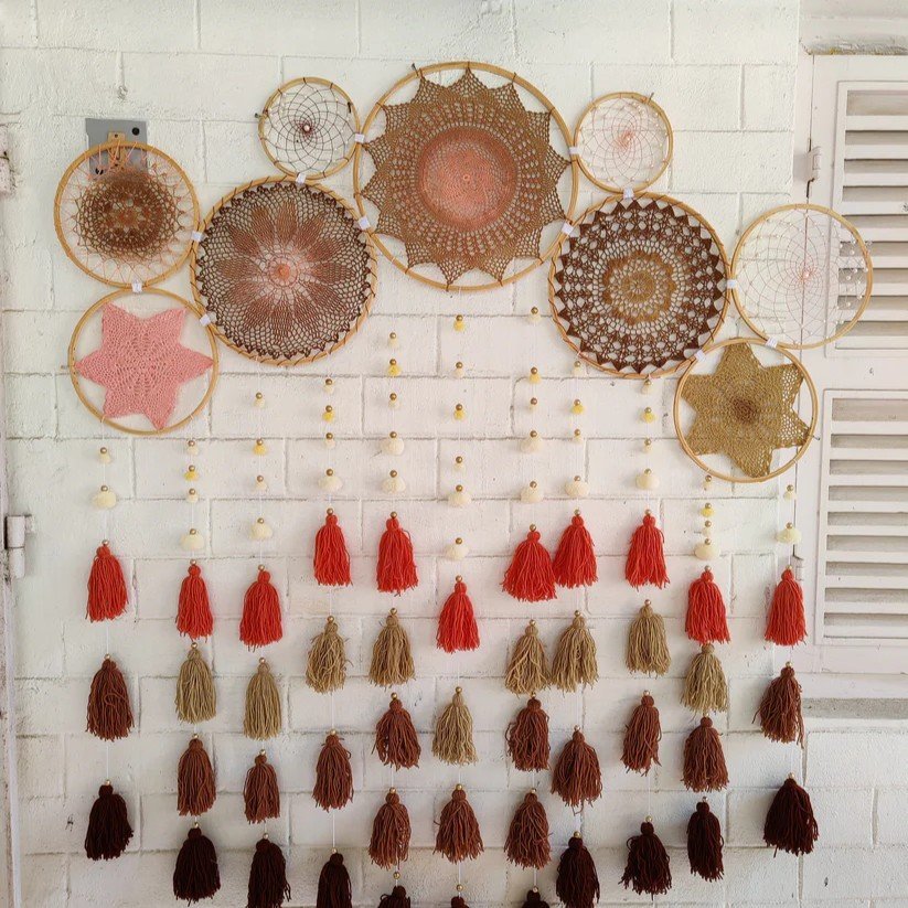Bring earthy elegance into your home with our Shades of Brown Cluster Dreamcatcher, handcrafted with wooden rings, crochets, threads, and artificial flowers. The warm brown tones create a grounded, rustic aesthetic, making it a perfect piece for those who love cozy, bohemian vibes.