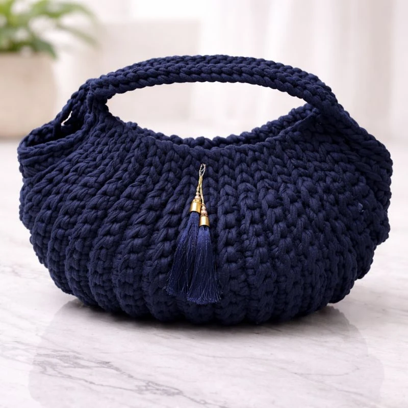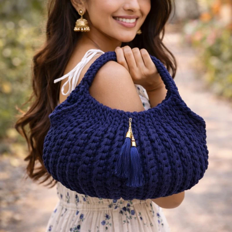 Upgrade your style with this Handmade Navy Blue Crochet Ladies Bag, crafted with premium thick yarn and a unique oval shape for a modern, elegant look. The sturdy braided handle and luxe tassel embellishment add a perfect touch of sophistication.