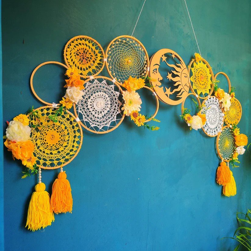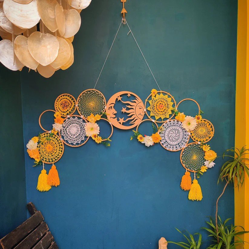 Add a celestial charm to your doorway or wall with the Sun Moon Star Dreamcatcher Toran. Crafted with wooden rings and crochet work in soothing shades of white and yellow, this 4 ft breadth and 25-inch length toran brightens up any space. Perfect as a self-gift or a thoughtful present for friends and family, it brings a boho-style elegance to your home décor.