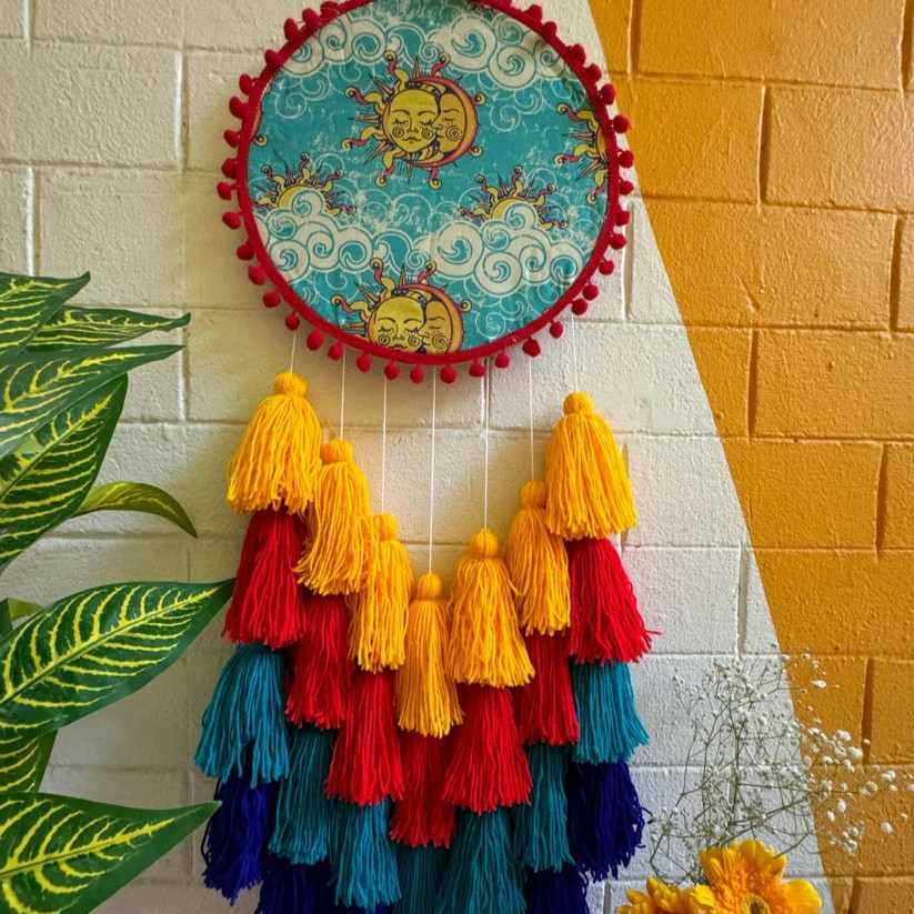 Bring celestial beauty and vibrant colors into your home with the Sun Moon Tasseled Dreamcatcher. Designed with wooden rings and colorful threads, this stunning piece combines the symbolism of the sun and moon with playful tassels in yellow, red, sky blue, and royal blue. Perfect for adding warmth and charm to your living space or gifting to loved ones.