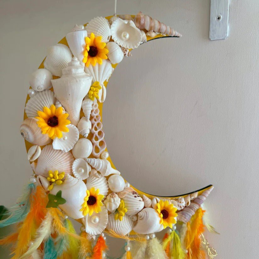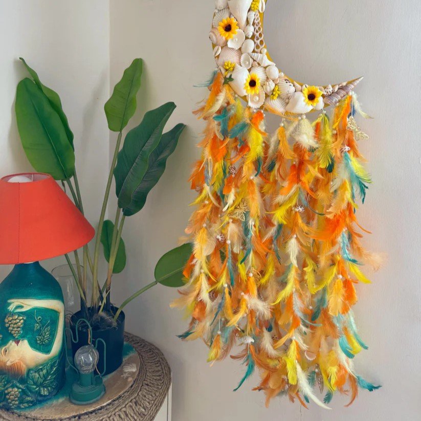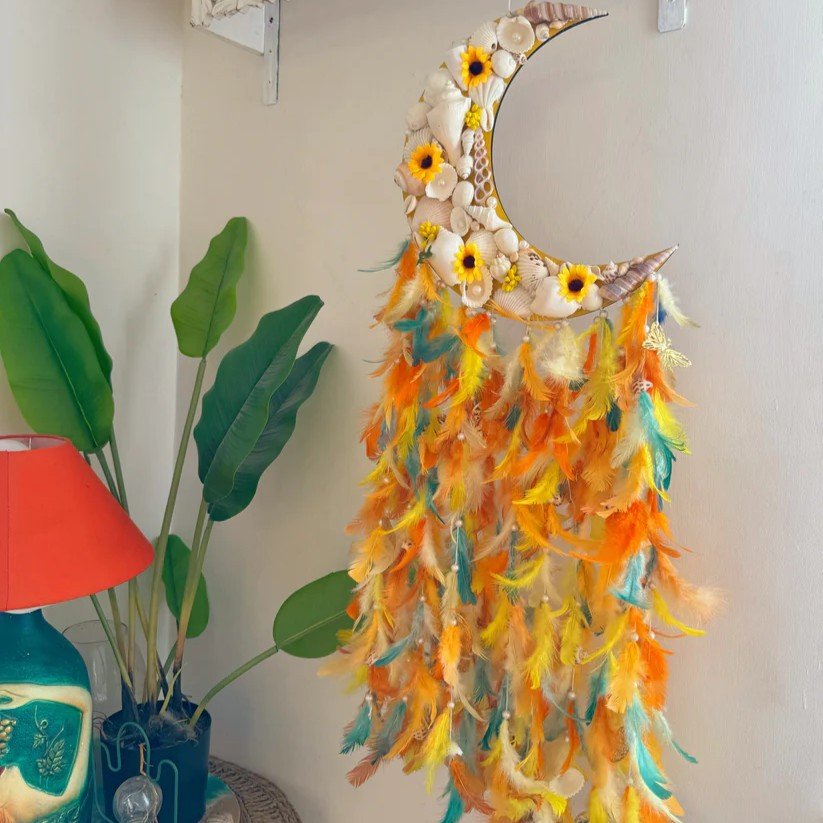 Add warmth and positivity to any space with the Sunflower Moon Flora Dreamcatcher. Designed in a stunning half-moon shape, this beautiful decor piece blends vibrant sunflower-inspired hues with natural elements like feathers and seashells. It makes a perfect centerpiece for your bedroom, living room, office, or special events like weddings and family gatherings. Every piece is thoughtfully handcrafted and securely packed, ensuring it reaches you as envisioned. Bring joy, love, and a boho-inspired charm into your home.