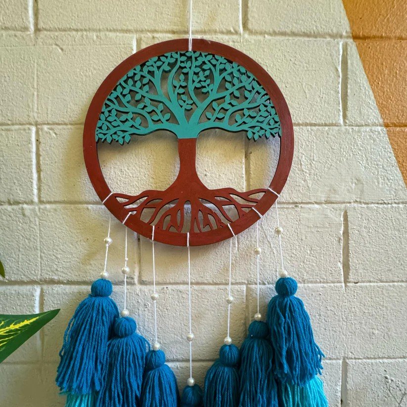 Celebrate harmony and beauty with the Tree of Life Tasseled Dreamcatcher. Crafted from wooden rings and soft threads, this decorative piece features soothing shades of blue and white, bringing a sense of calm and elegance to any room. Its boho charm and serene colors make it an ideal gift or a stylish addition to your home décor.