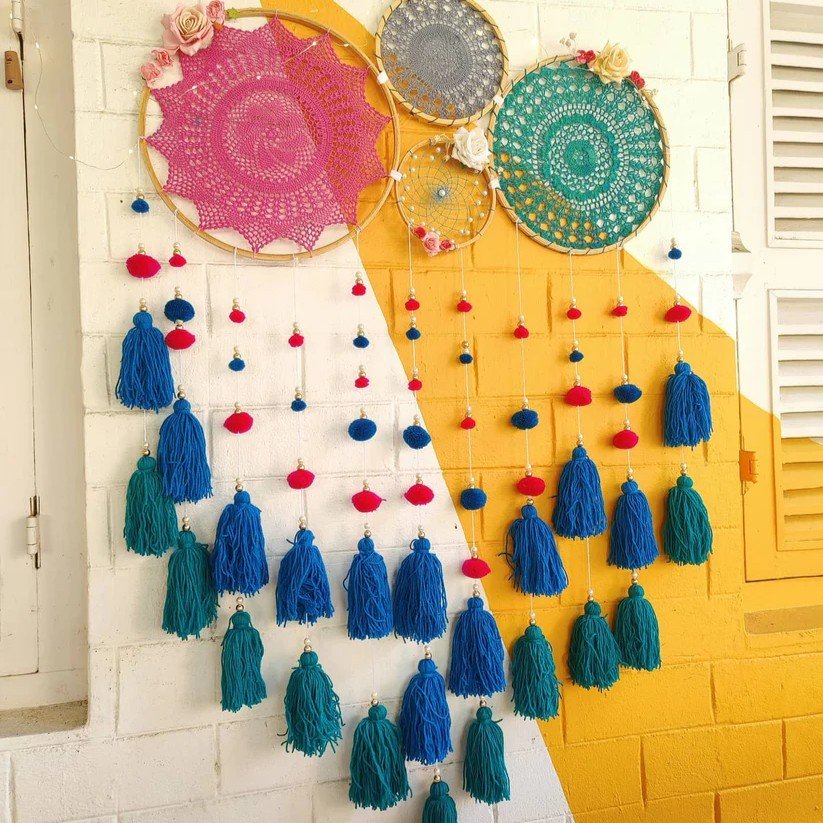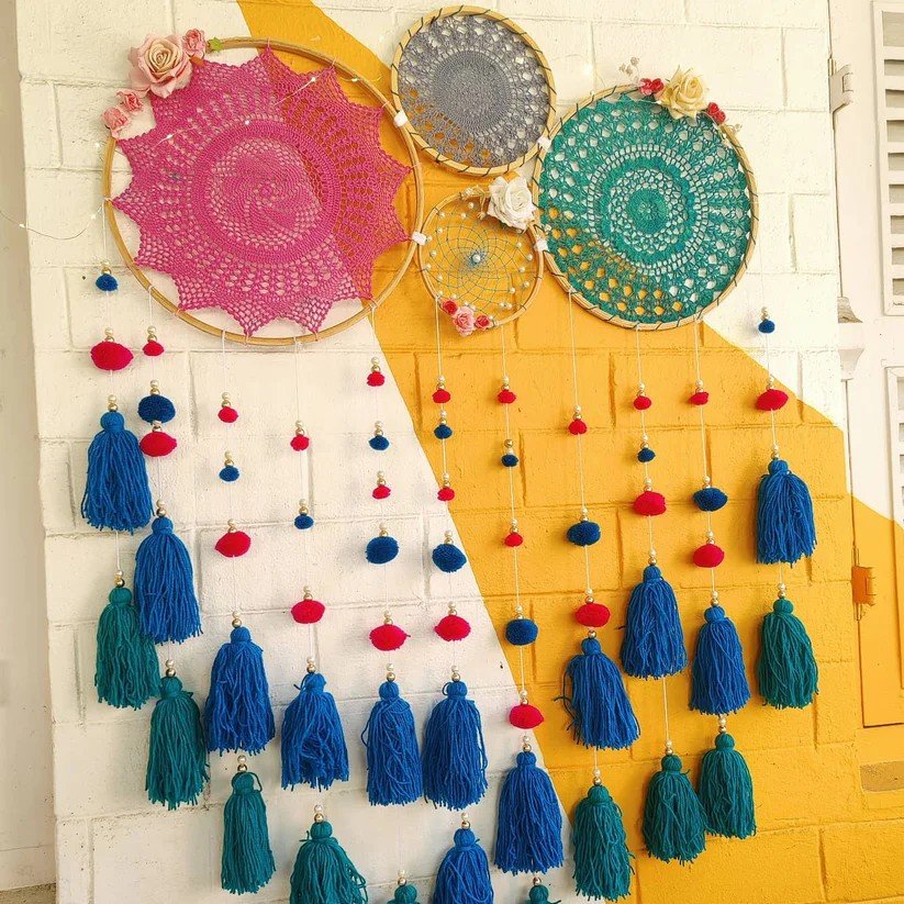 Add a splash of bohemian elegance to your home with the Turquoise Grace Dreamcatcher. Handcrafted using wooden rings, crochet work, threads, and artificial flowers, this 3.5ft × 4ft dreamcatcher creates a stunning focal point for any room. Its vibrant multi-color palette brings warmth, charm, and a playful yet sophisticated vibe to your space.