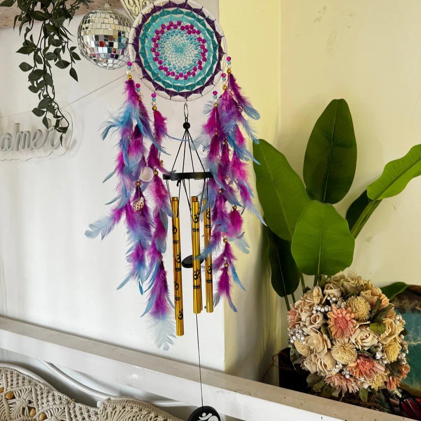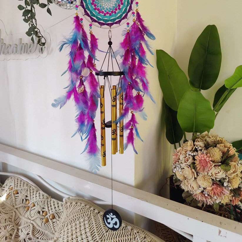 Add a touch of serenity and color to your space with the Twilight Omm Windchime Dreamcatcher. Featuring a delicate cobweb design wrapped in wool, high-quality feathers, and metal charms, this dreamcatcher exudes boho charm while producing gentle windchime sounds. The shades of pink, purple, and magenta create a vibrant, uplifting ambiance for any room.