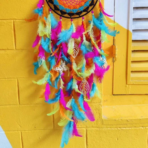 Vintage-Inspired Bohemian Accent – Its retro charm is enhanced by a layered mix of feathers, beads, and shells, creating an eye-catching blend of texture and depth.