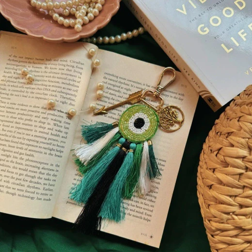 Protective Bohemian Charm – Featuring a symbolic evil eye for warding off negativity, accented with playful tassels and a cowbell for added good-luck energy