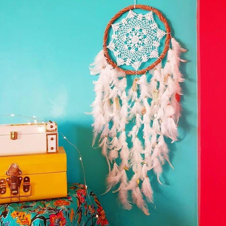 Elevate your space with the White Love Crochet Dreamcatcher, a delicate blend of soft wool, feathers, and thread. Featuring a charming crochet design, each piece is slightly unique, adding a handmade touch to your boho décor. Its pristine white tones bring elegance and brightness to any room, creating a peaceful and uplifting ambiance.