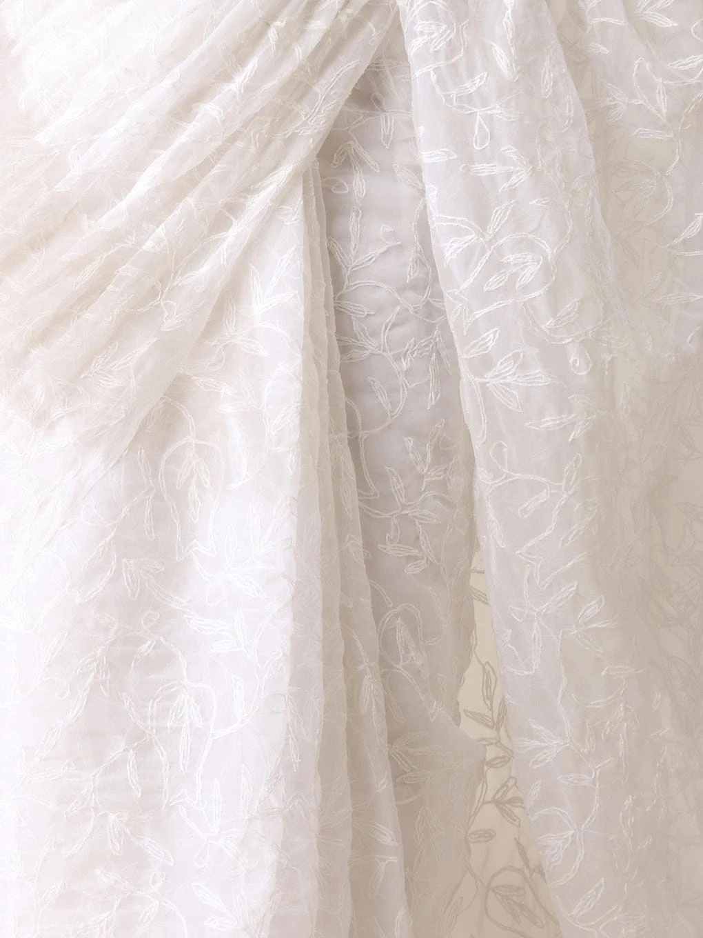 The pristine white shade symbolizes purity and sophistication, making this saree a perfect choice for festive occasions, intimate celebrations, daytime weddings, summer gatherings, and refined evening wear. Its sheer texture and fluid drape offer unmatched comfort with a graceful silhouette