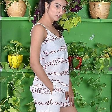 Crisp white base colour with printed motif pattern—relaxed yet stylish for home wear, sleepwear, beach casual or lounge set.