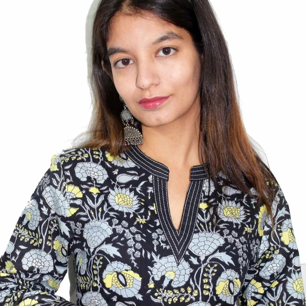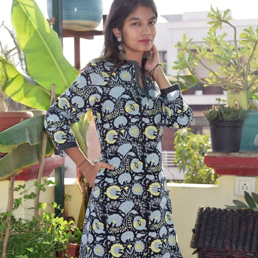 Elevate your ethnic wardrobe with this Women’s Black V-Neck Printed Cotton Kurta. Crafted from soft, breathable 100% cotton, this kurti offers comfort and style for everyday wear. The rich black hue gives it a versatile base, while the subtle print on the neckline and sleeves adds just the right amount of design interest.