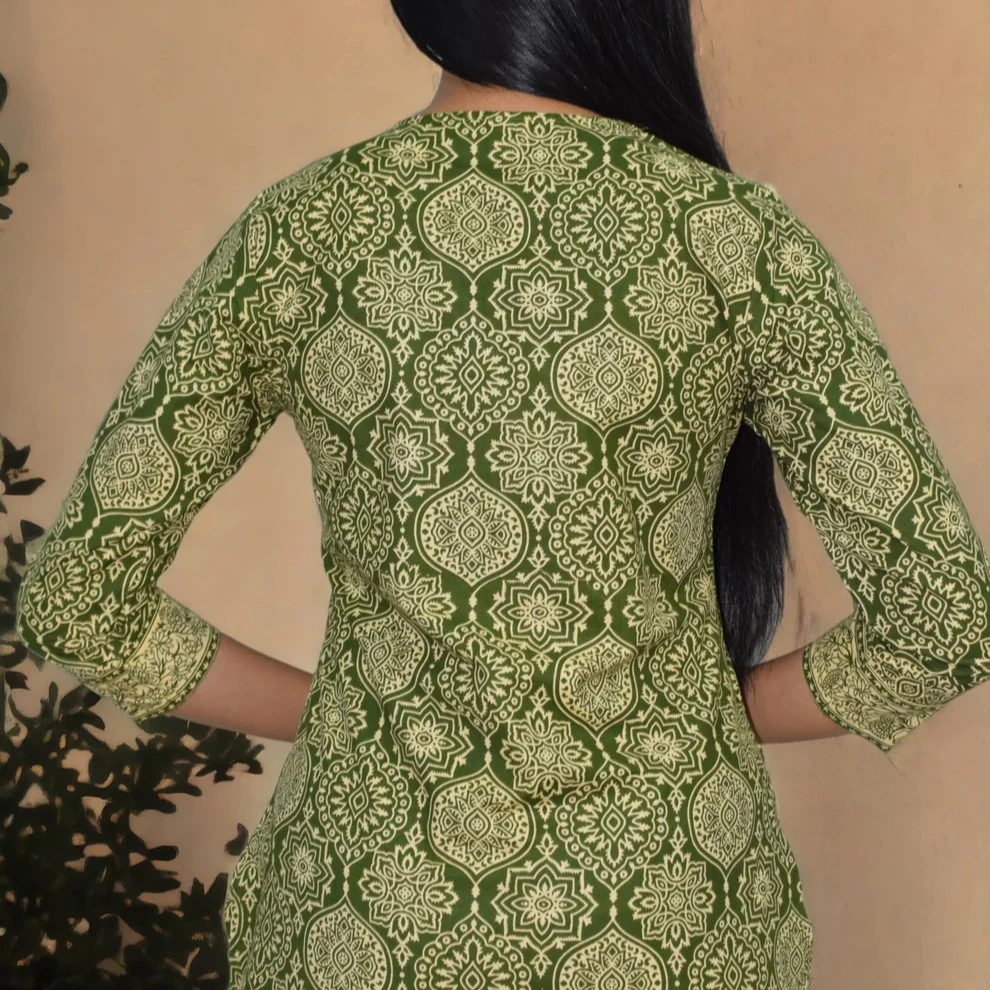 Infuse your wardrobe with artisan charm and comfortable elegance with this Women’s Mughal Green Cotton V-Neck Short Kurti. Crafted from soft, breathable 100% cotton and featuring authentic hand-block printed design, this kurti captures the relaxed yet refined spirit of contemporary ethnic wear.